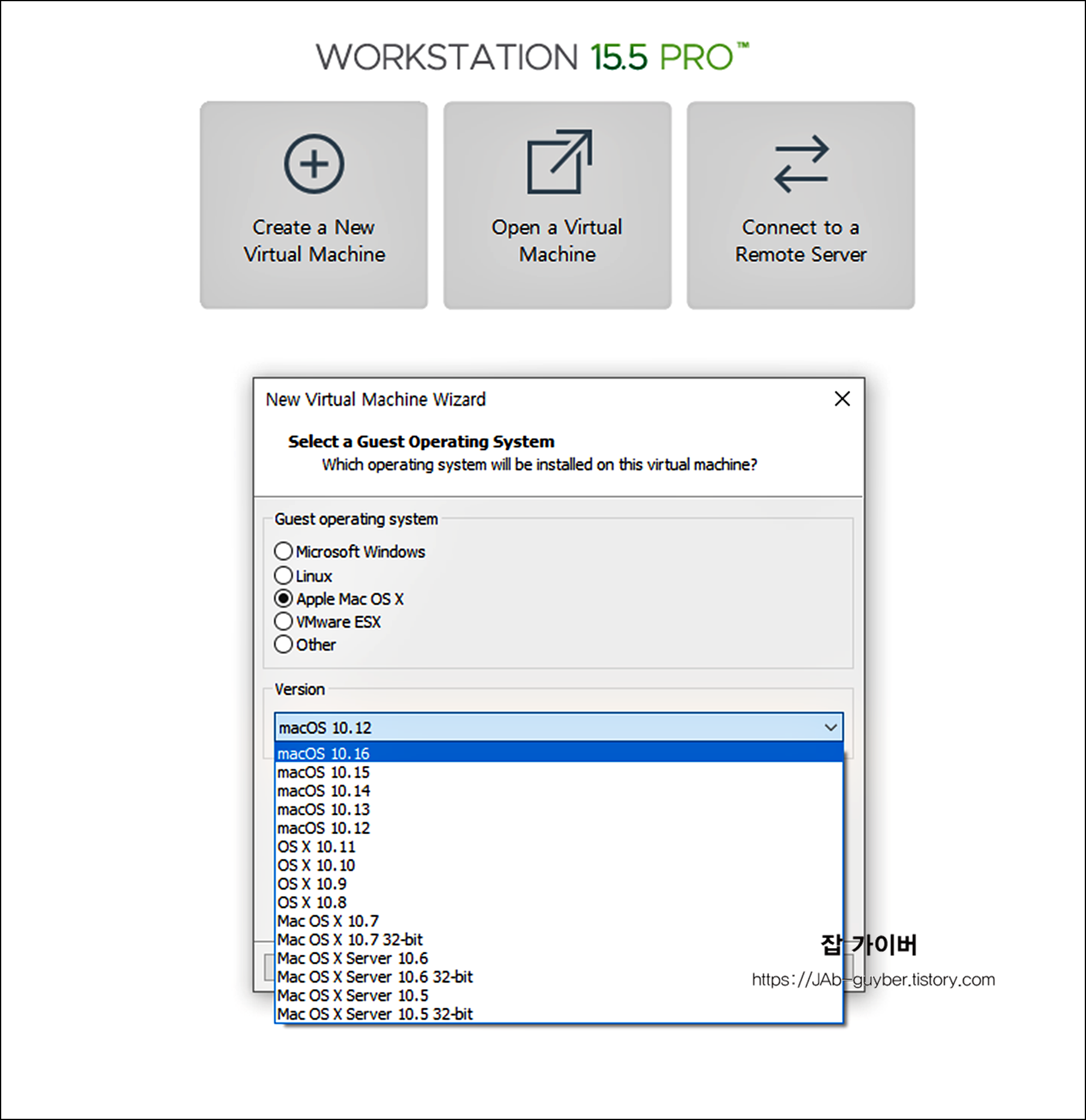 현재 VMWare Workstation 15.5버전으로 지원가능한 Mac OS X의 운영체제 종류입니다.