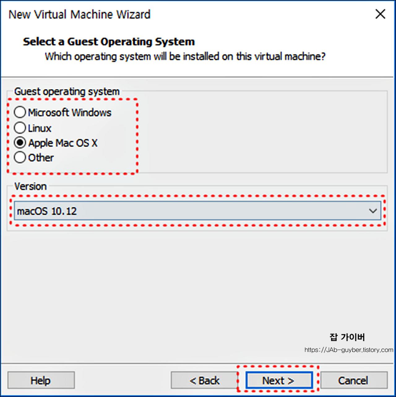 가상 머신 설정에서 필요한 리소스(메모리, 디스크 공간 등)를 할당하며 가상 머신에 설치할 운영 체제로 "Mac OS X"를 선택합니다.