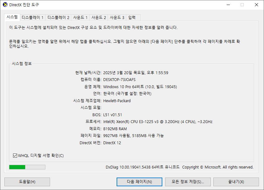 "DirectX 진단 도구" 창이 열리면, 하단의 "DirectX 버전" 항목에서 현재 설치된 DirectX 버전을 확인할 수 있습니다.