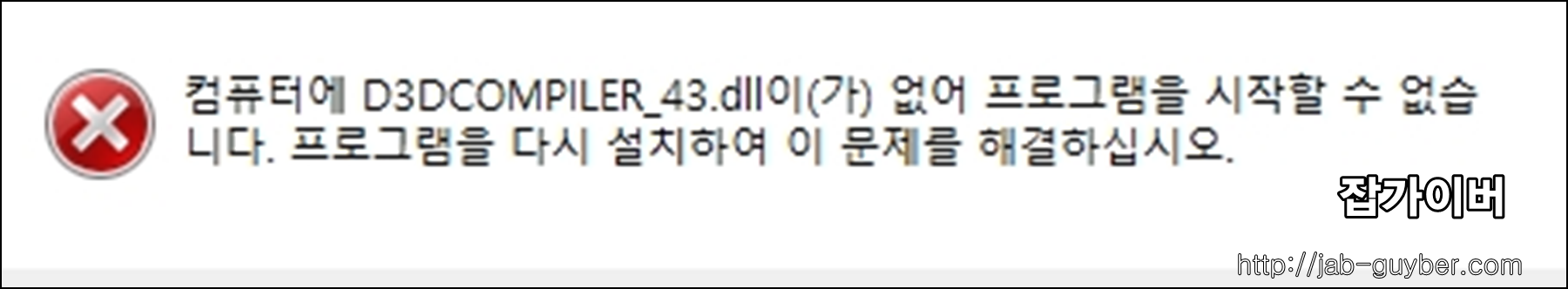 보는것과 같이 프로그램을 설치하고자 하면 "컴퓨터에 D3DCOMPILER_43.DLL이(가) 없어 프로그램을 시작할 수 없습니다. 프로그램을 다시 설치하여 이 문제를 해결하십시오." 와 같은 알림이 뜨면서 프로그램 설치가 되지 않습니다.