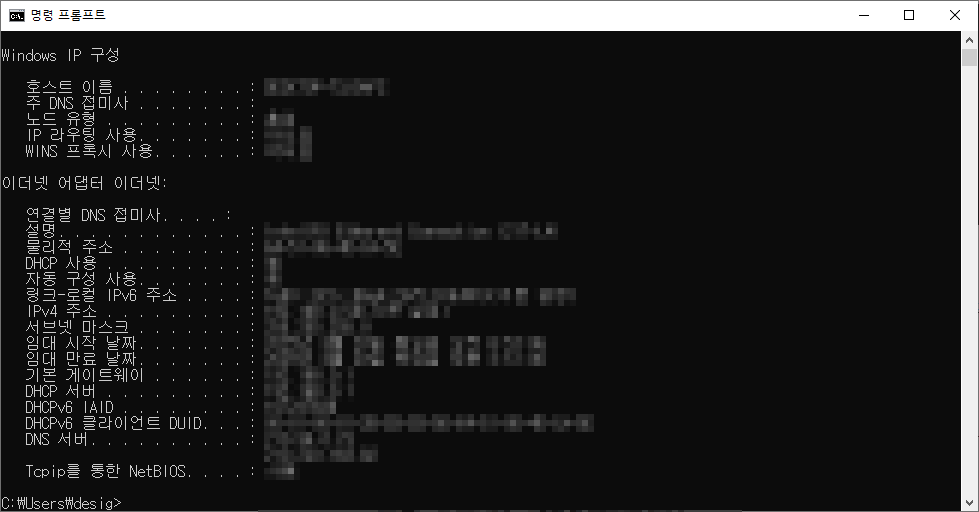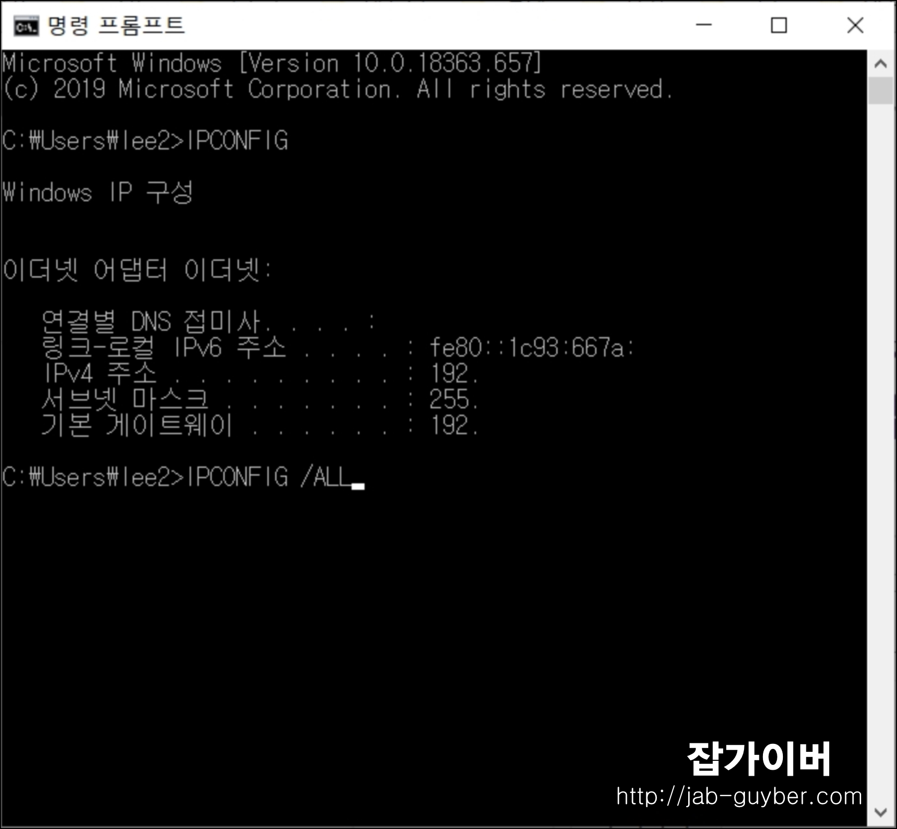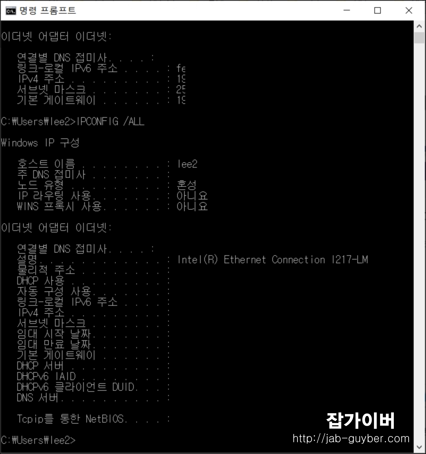 그 외에 "IPCONFIG/ALL"이라고 입력하게 되면 더 많은 컴퓨터 이더넷 주소를 확인할 수 있습니다.