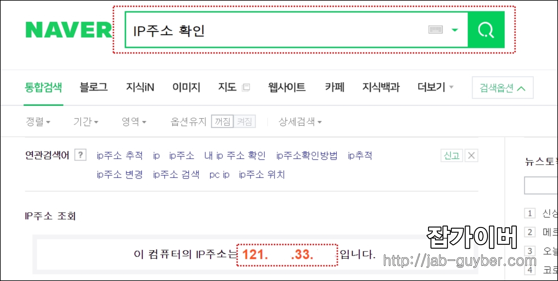 가장간단하게 자신의 주소를 확인하는 방법은 "네이버 검색엔진"에서 "IP주소 확인"로 검색하면 됩니다.