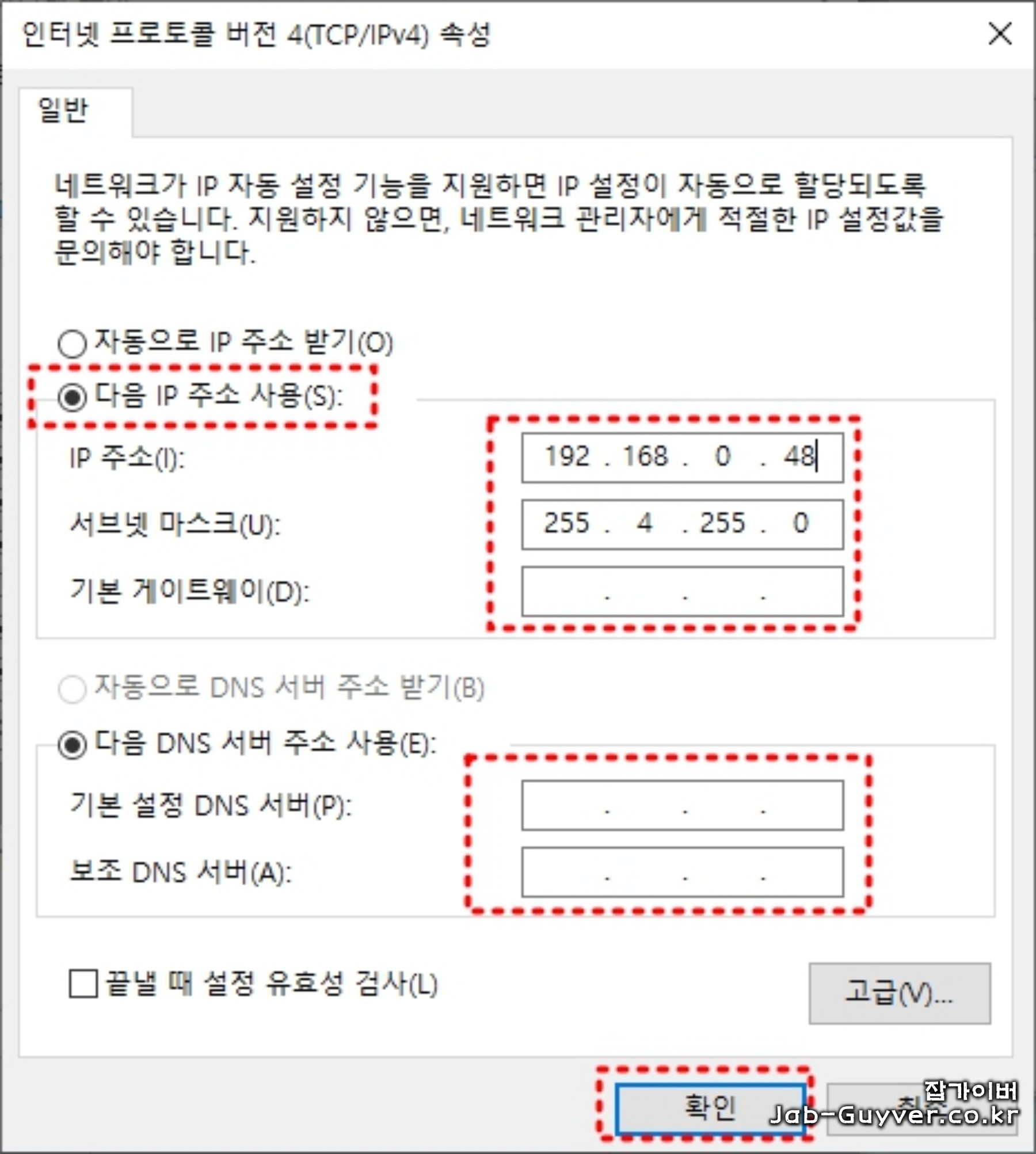 원하는 IP 주소, 서브넷 마스크, 기본 게이트웨이 및 DNS 서버 정보를 입력합니다.
