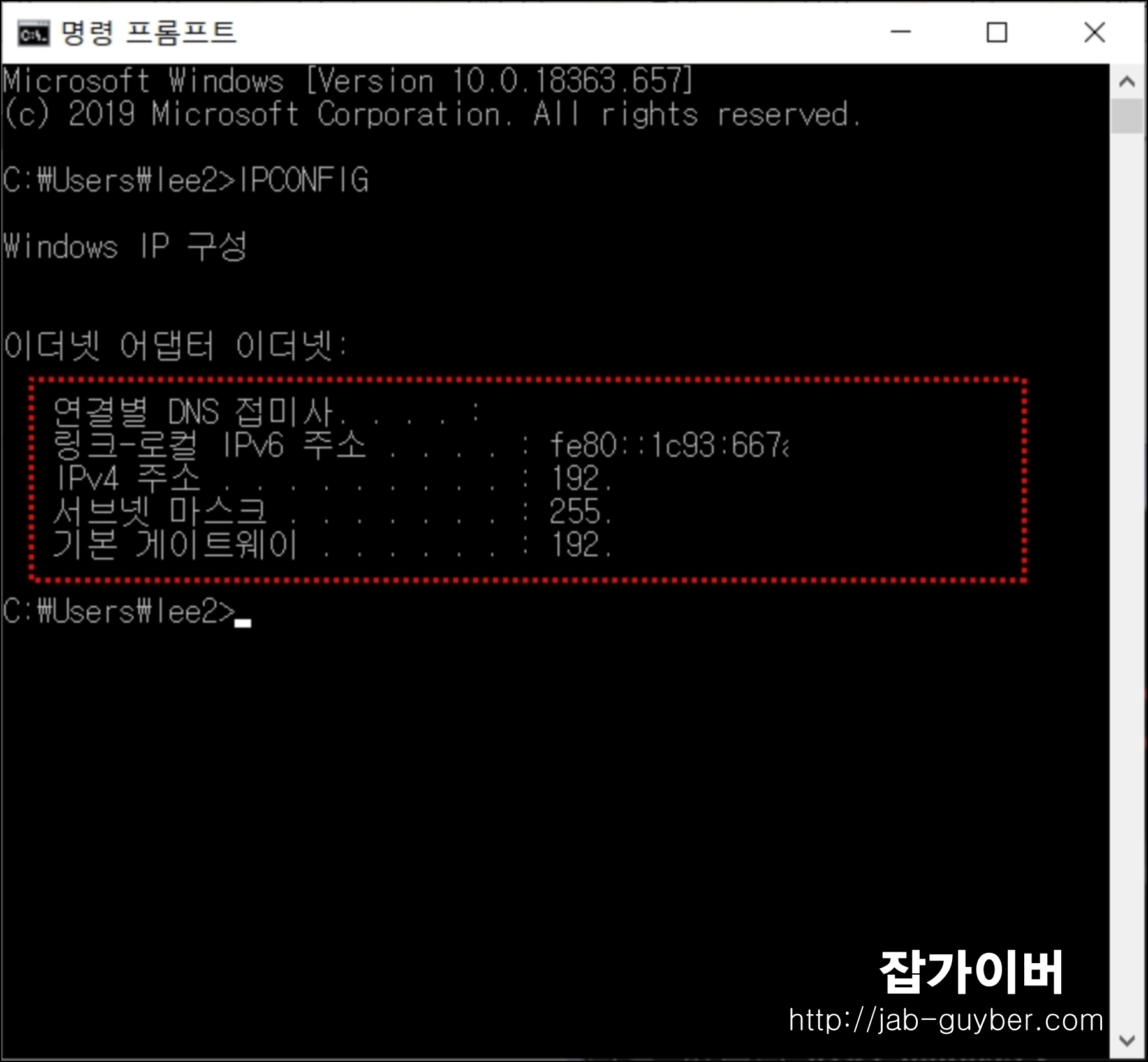 이후 "IPCONFIG"를 입력 후 엔터를 누르면