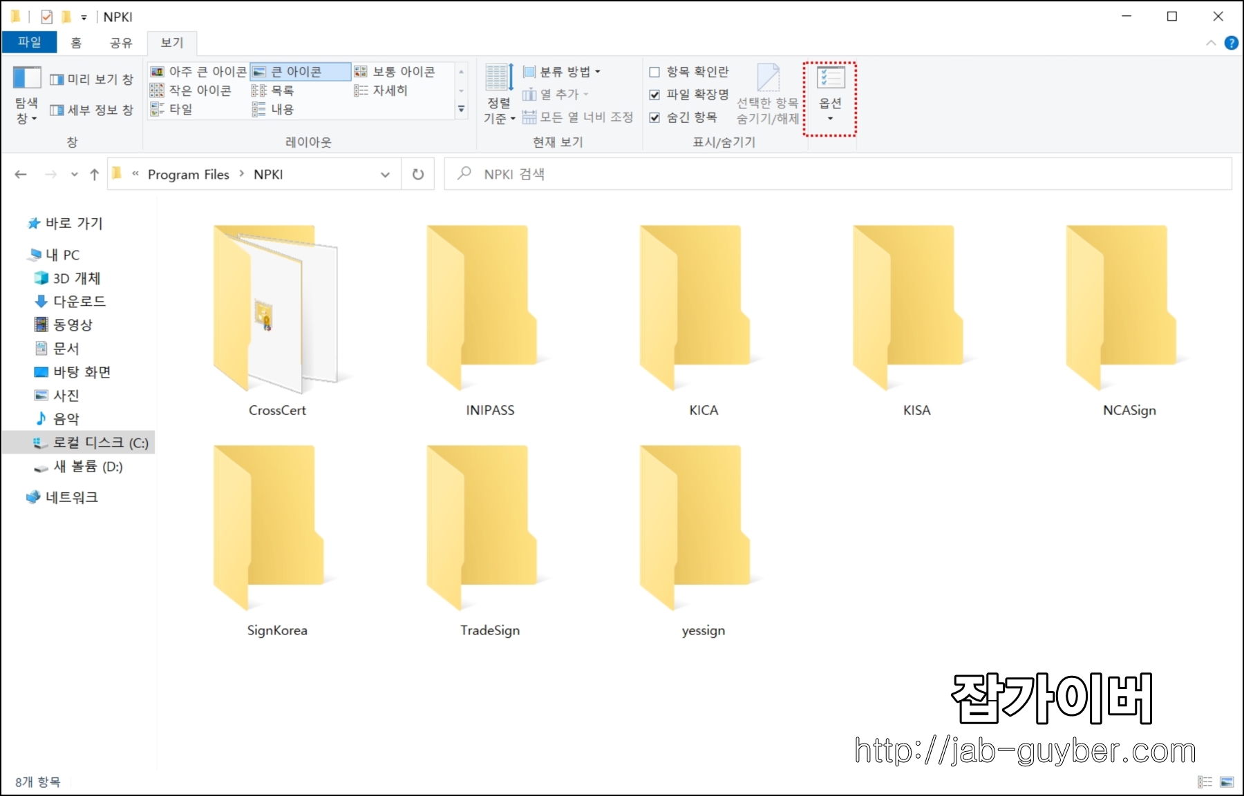 탐색기에서 옵션을 열고, 보기 항목에서 숨김 파일 및 폴더 표시를 켜면 NPKI 안쪽 내용이 제대로 나타나는 경우가 많다.