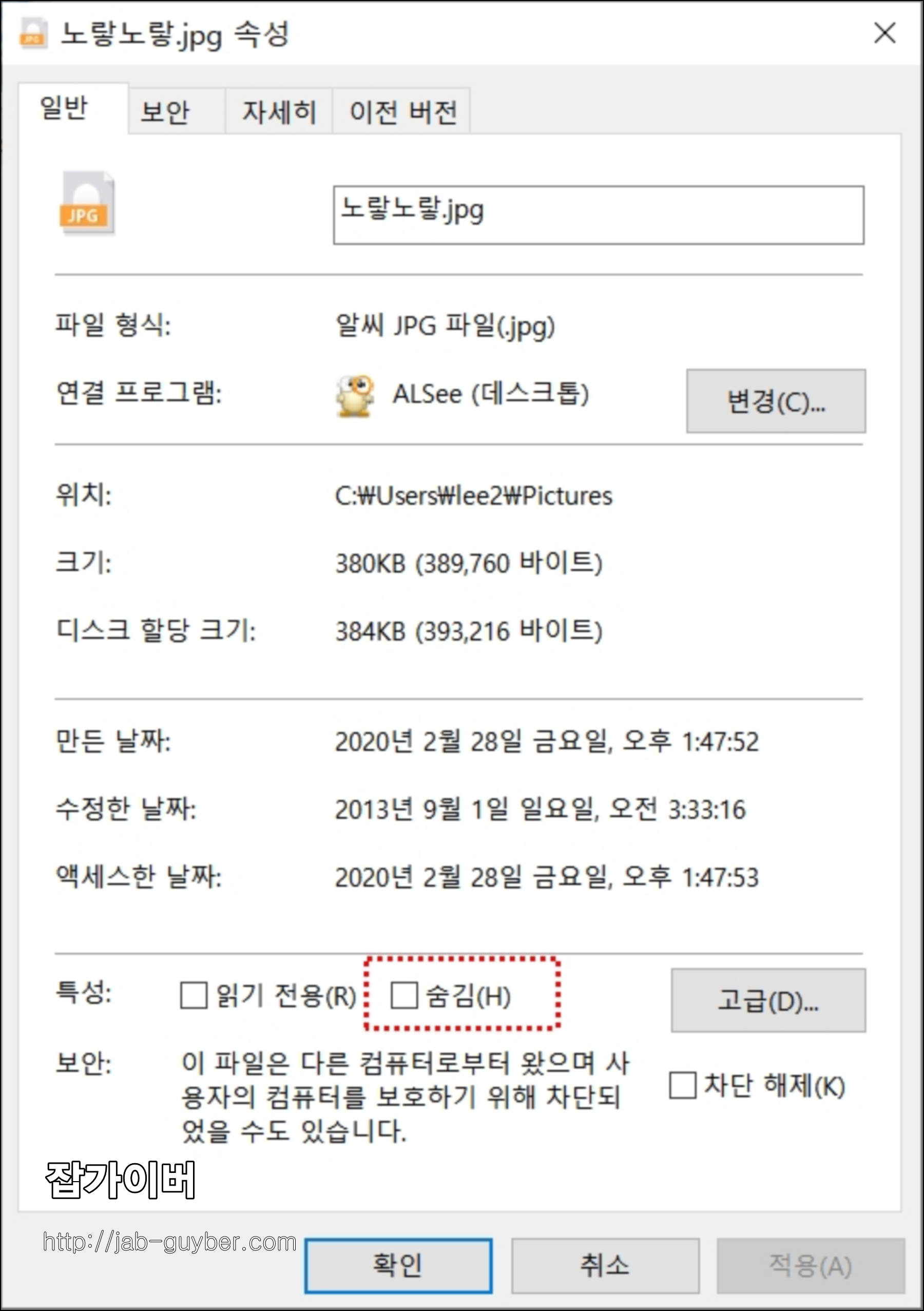 그럼 일반 -> 속성에 보면 "숨김"항목을 체크할 수 있습니다.