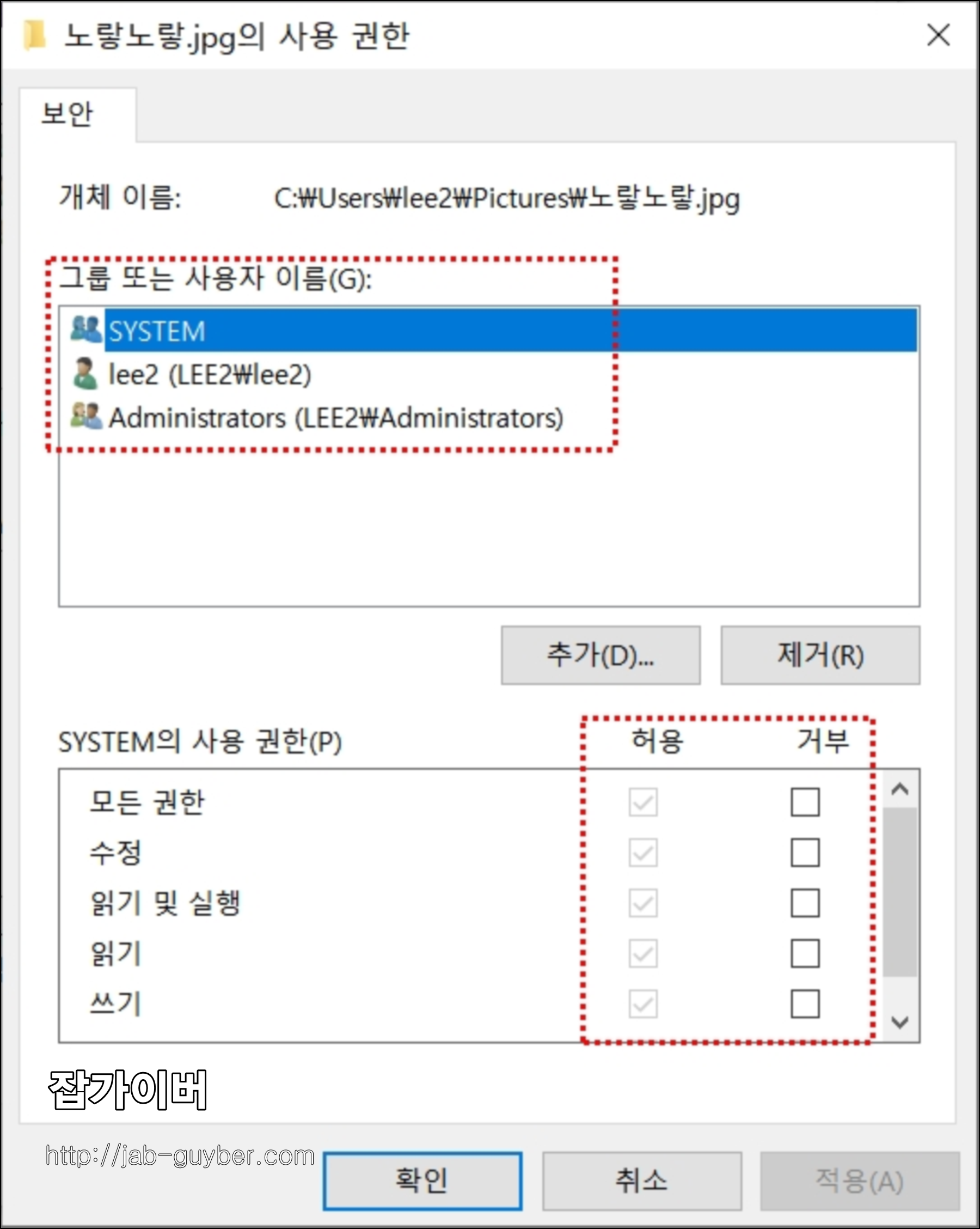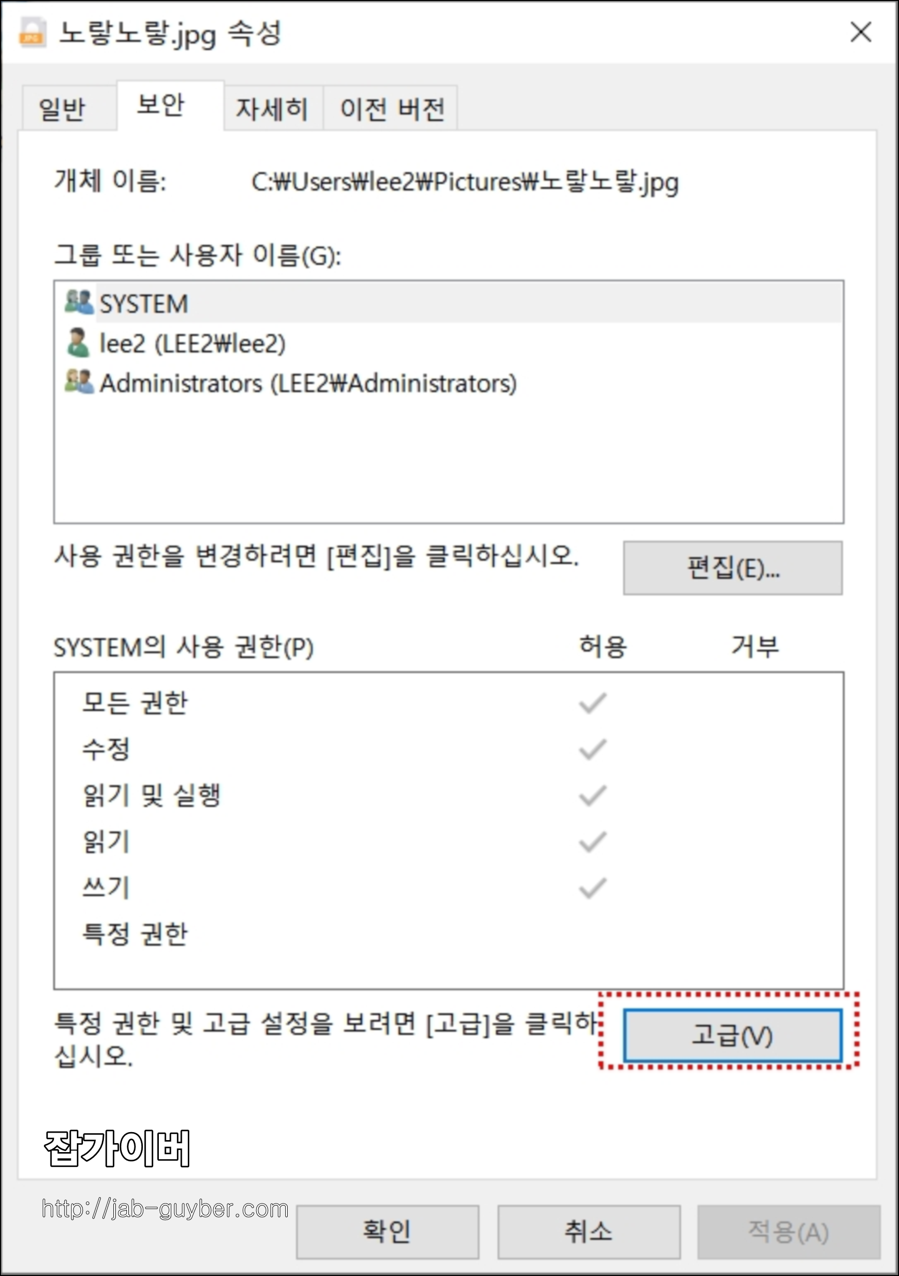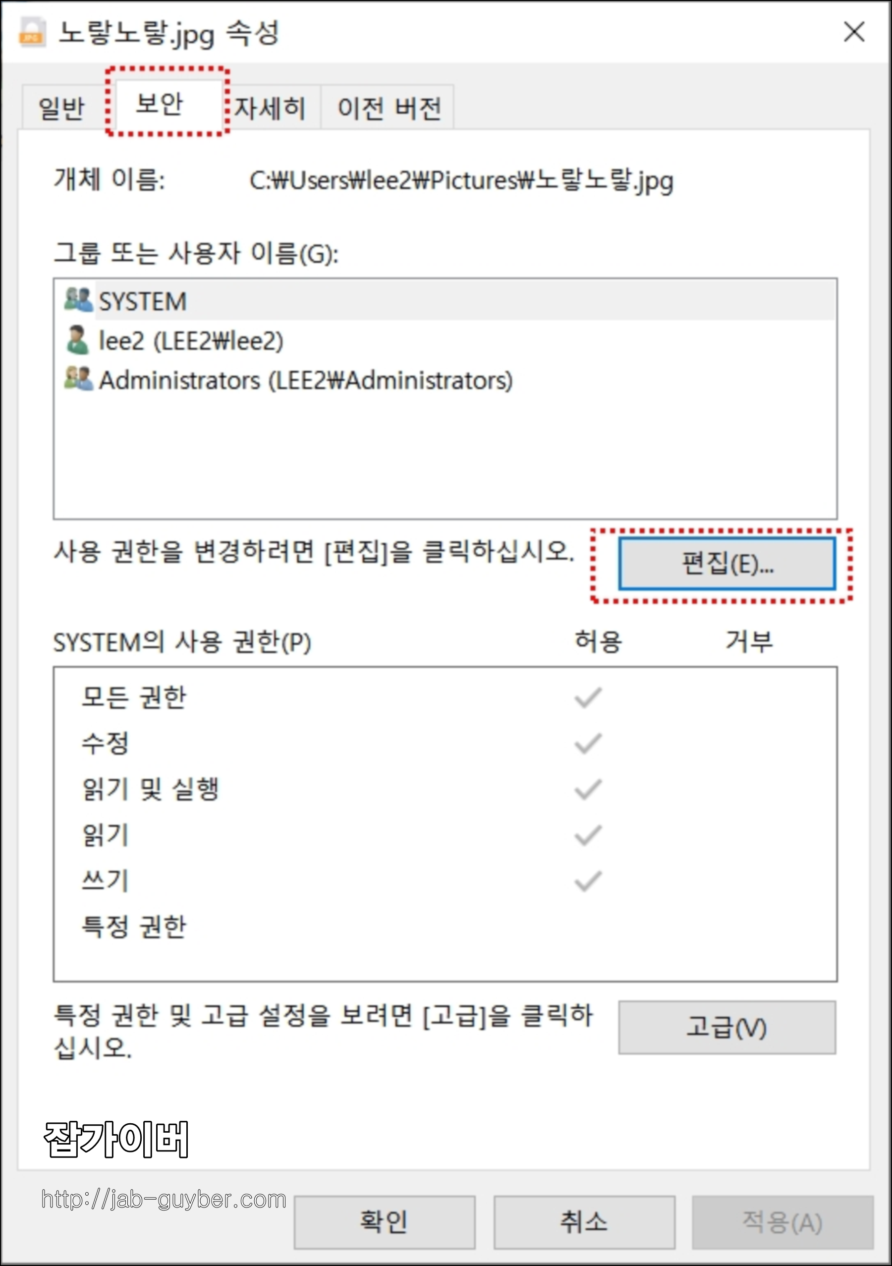 그 외에 보안탭을 이동 후 그룹 및 사용자 이름에 대한 사용권한을 읽기 및 쓰기 권한을 설정할 수 있습니다.