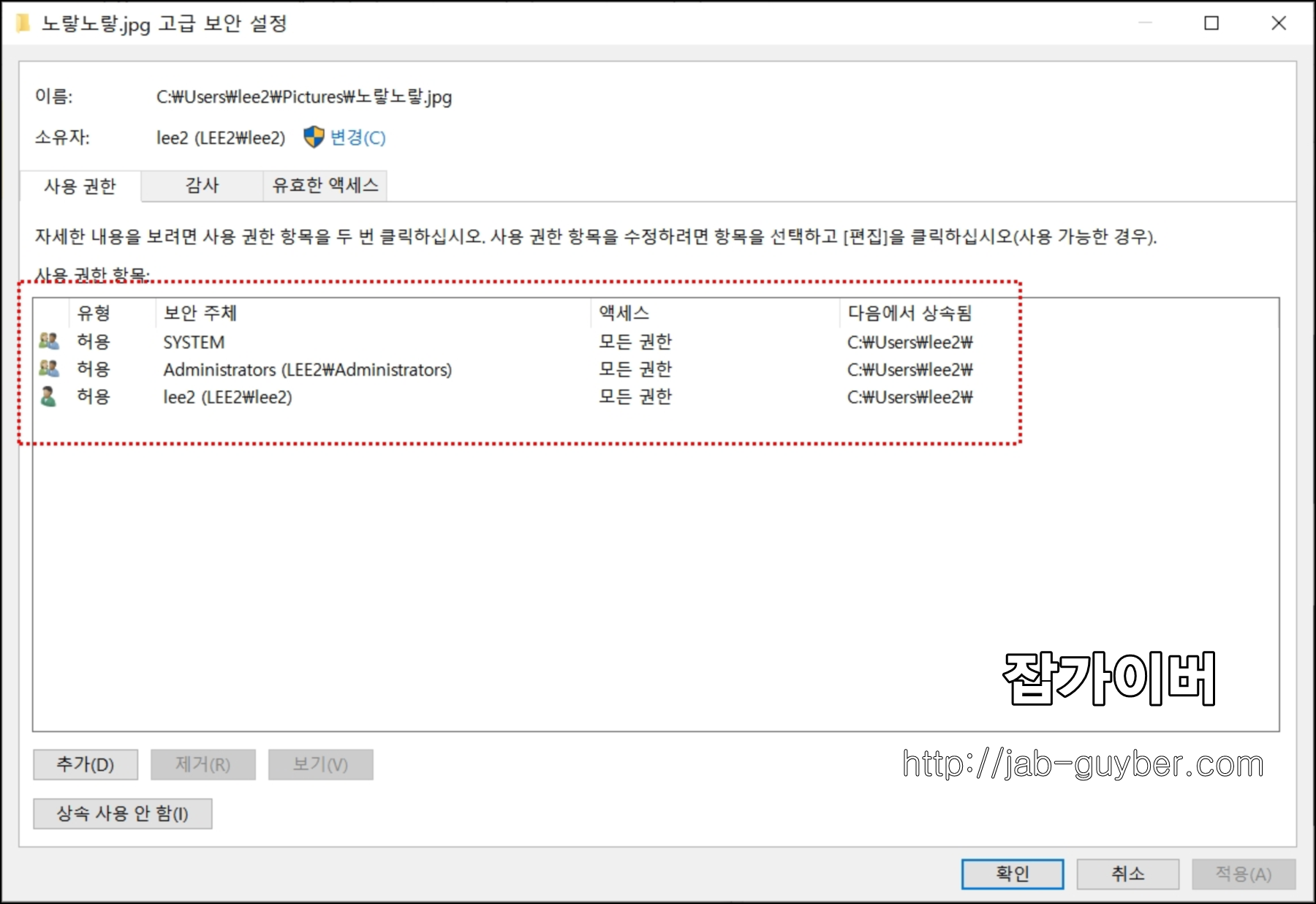 이렇게 설정된 권한은 해당 파일 또는 폴더에 적용되며, 사용자 또는 그룹에 대한 접근 권한을 정확하게 제어할 수 있습니다.