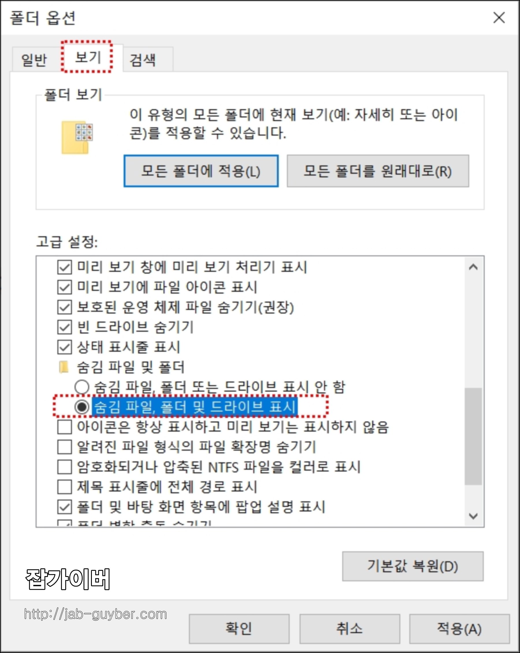 - 숨김 파일 및 폴더 및 드라이브 표시