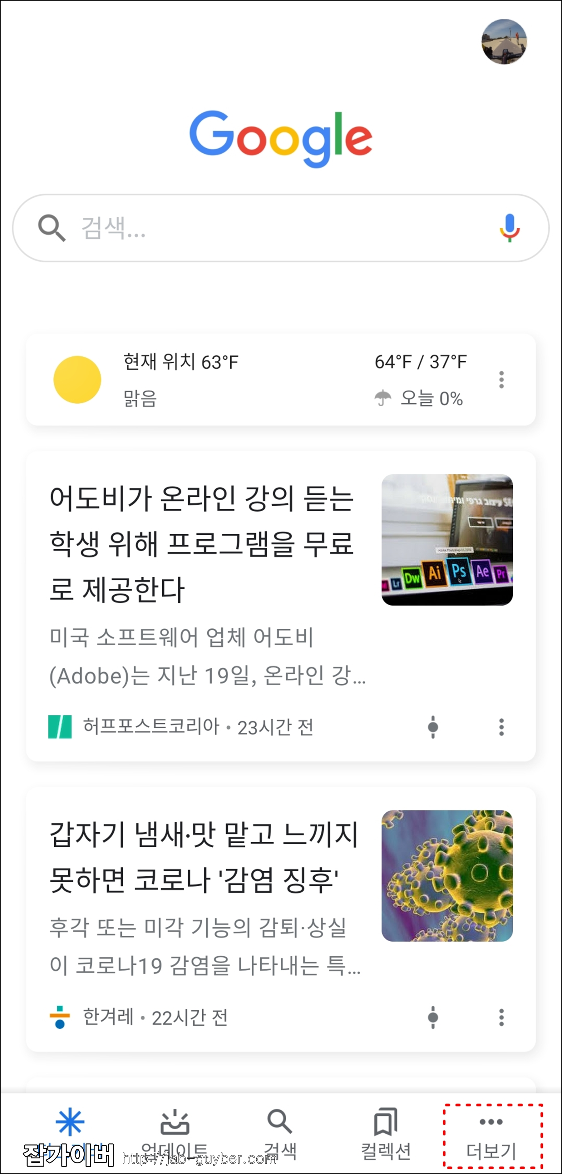 홈 화면이나 앱 서랍에서 Google 앱을 실행한 뒤, 우측 하단 또는 프로필 아이콘 근처에 있는 ‘더보기’ 또는 설정 메뉴를 눌러 들어갑니다.