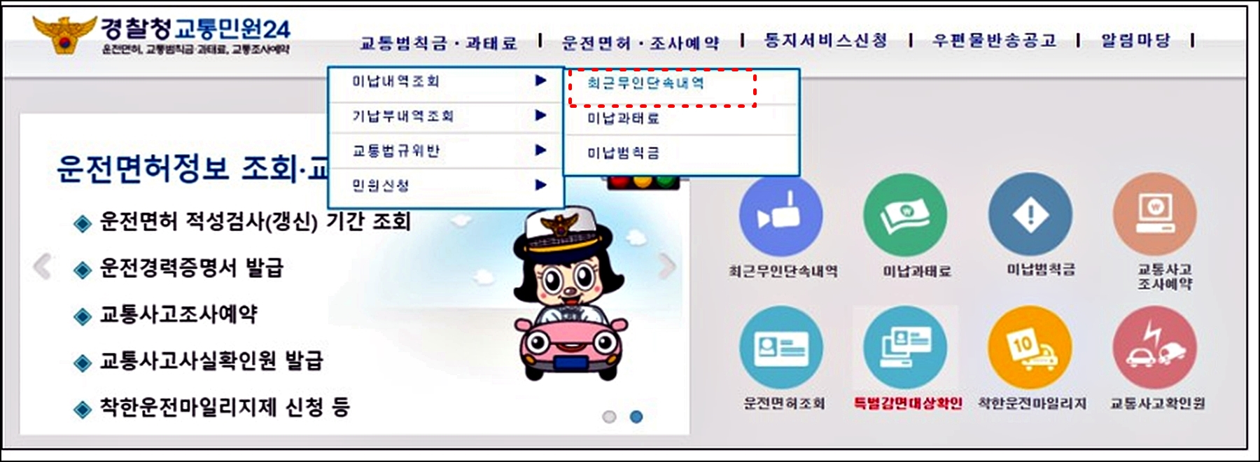 다음 상단에 교통범칙금 과태료 -> 미납내역 조회 -> 최근 무인단속내역을 선택합니다.