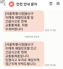 - 긴급재난문자 : 전쟁, 지진, 쓰나미 등이 났을 때 발송됩니다. 문자가 올 때 경보음이 울리는데 여러분이 아시는 그 소리입니다.
