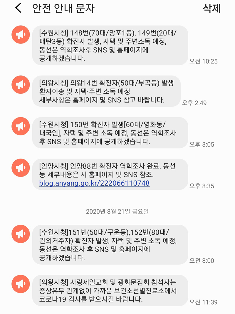 - 공공 안전 경보: 확진자 안내, 폭염주의보, 미세먼지 조치 발령 등 위의 상황보다는 덜 긴급할 때에 발송됩니다.