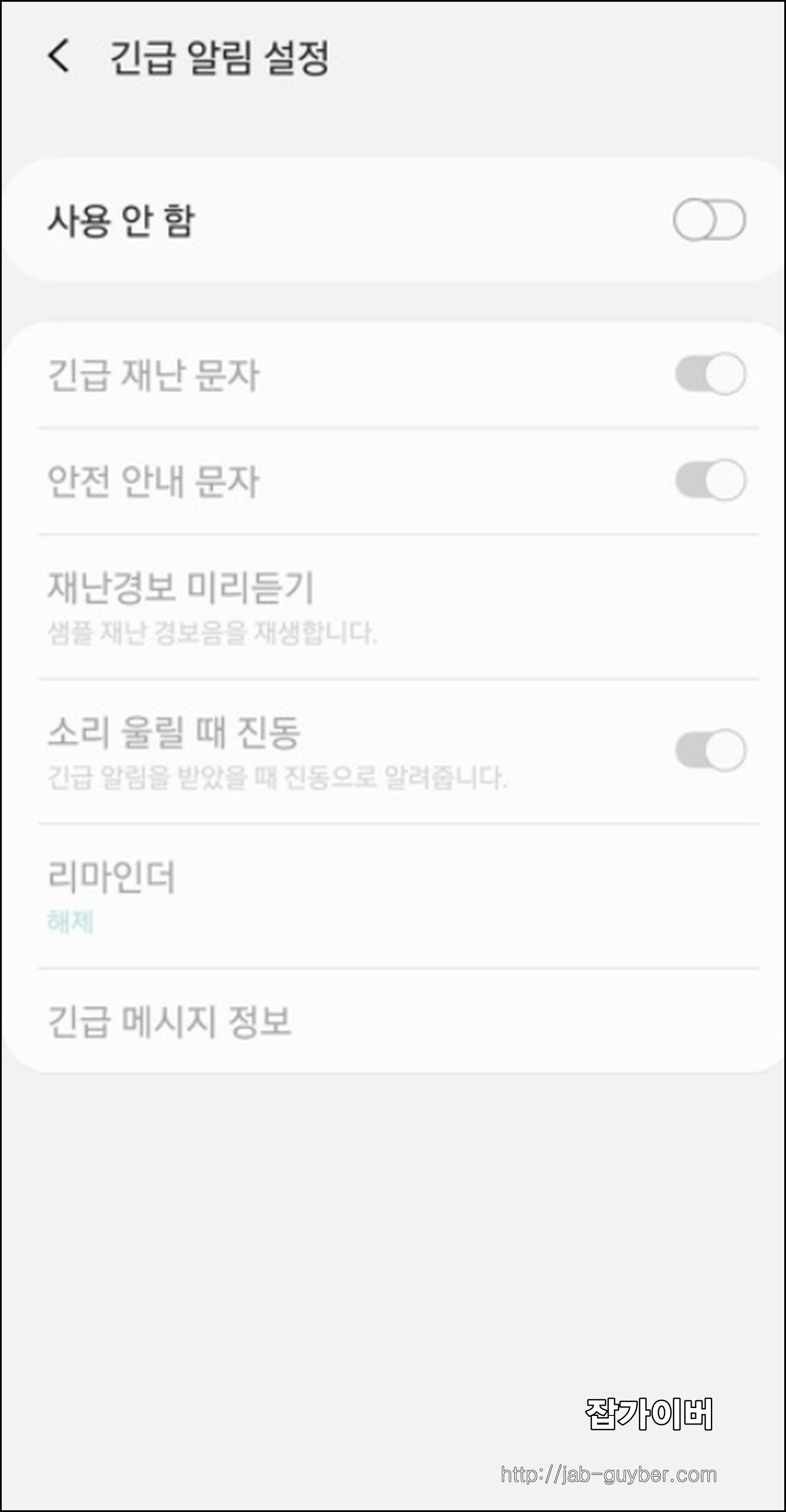 재난문자 끄기 방법은 이것을 사용 안 함으로 변경하시면 긴급 재난문자 및 안전 안내문자 모두 받을 수 없습니다.