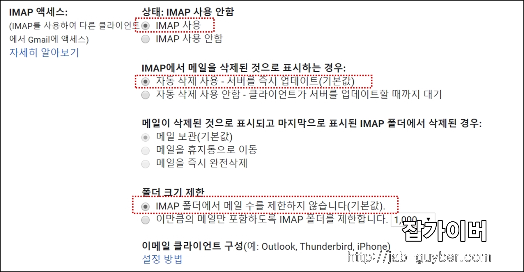 전달 및 POP/IMAP 탭으로 이동 후 액세스 상태를 IMAP사용으로 선택합니다.