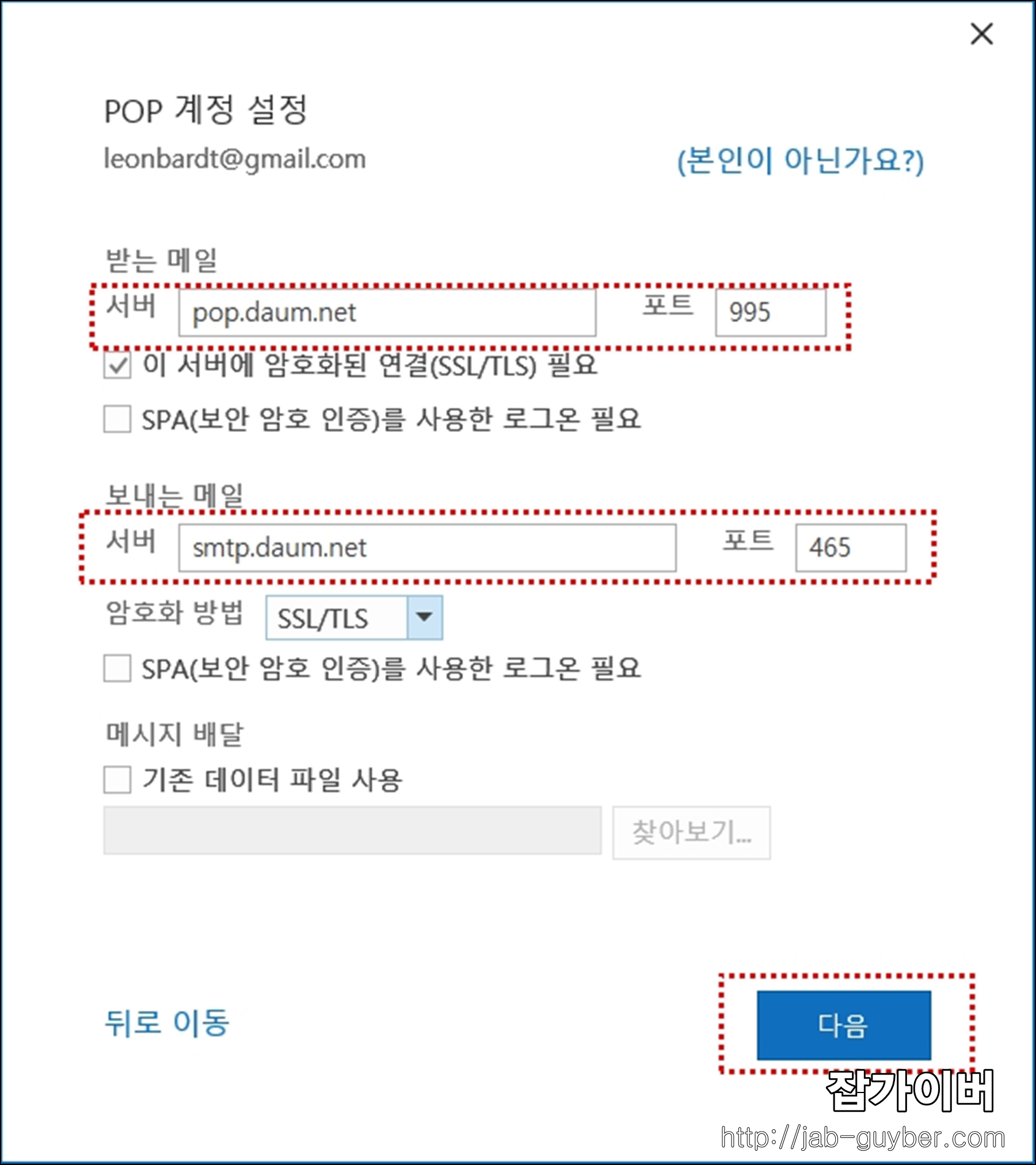 입력하는 것으로 다음 한메일의 아웃룩 설정이 완료됩니다.