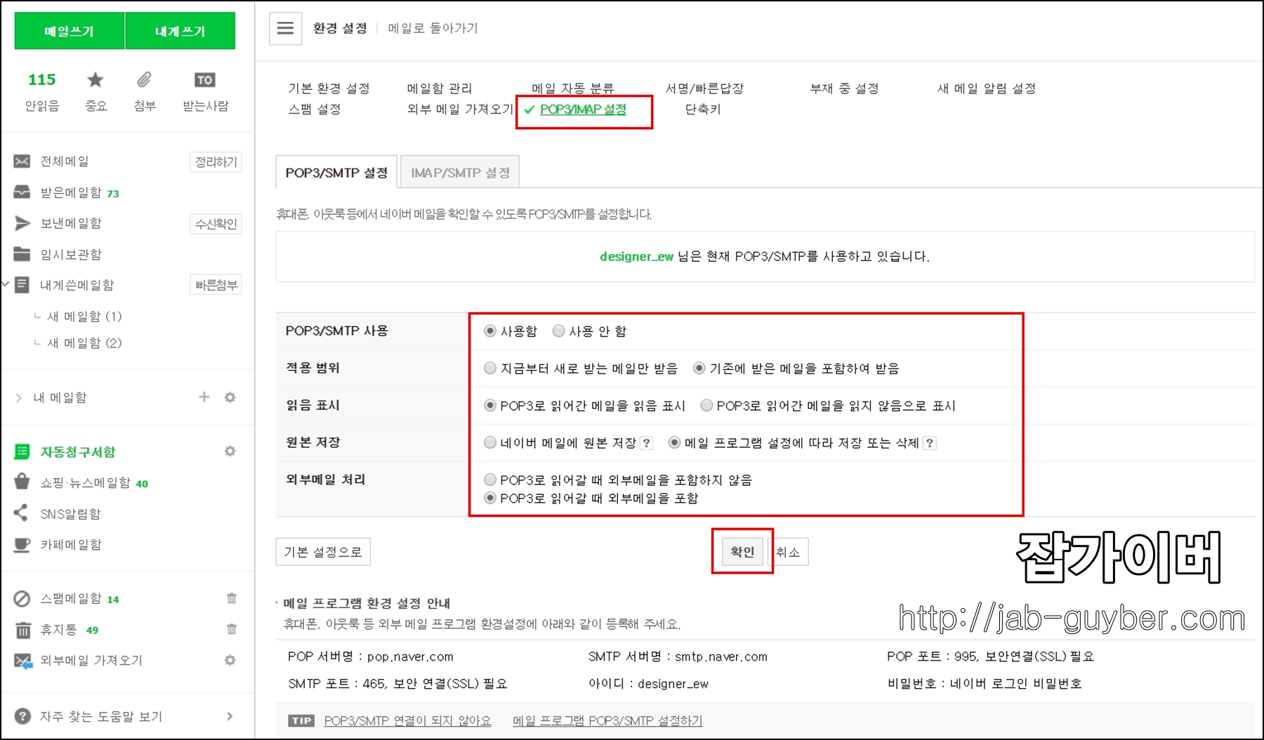 네이버 메일에 로그인한 후 '환경설정' > 'POP3/IMAP 설정'에서 POP3/SMTP를 '사용함'으로 설정합니다.