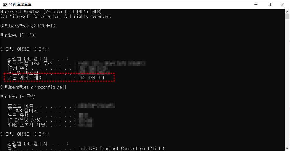 192.168.0.1이 아닌 경우, CMD에서 ipconfig 명령어를 입력하여 기본 게이트웨이 주소를 확인할 수 있습니다.