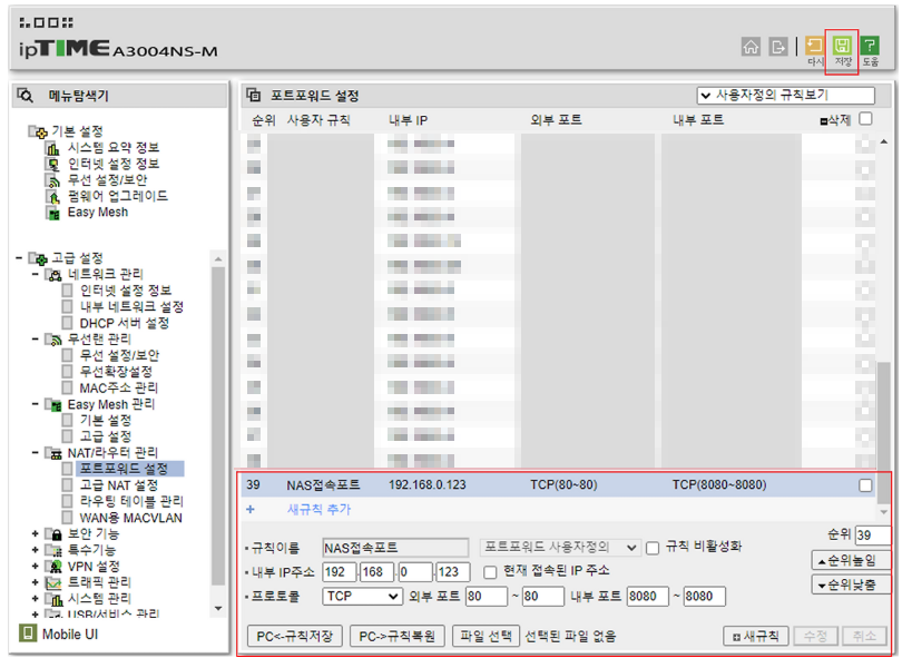 고급설정 → NAT설정 → 포트 포워딩 |