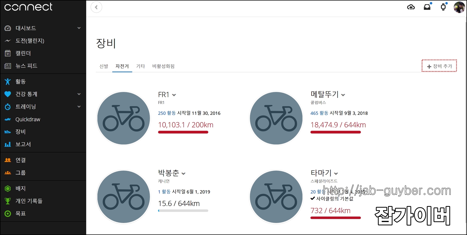 그리고 이러한 분석 중 가장 먼저 진행되어야 하는 것이 바로 자신이 사용하고 있는 운동장비에 대한 등록으로서 달리기 및 자전거등에서 사용되는 장비를 등록해서 해당 장비로 얼만큼의 운동을 했는지를 확인하느것이 가능합니다.