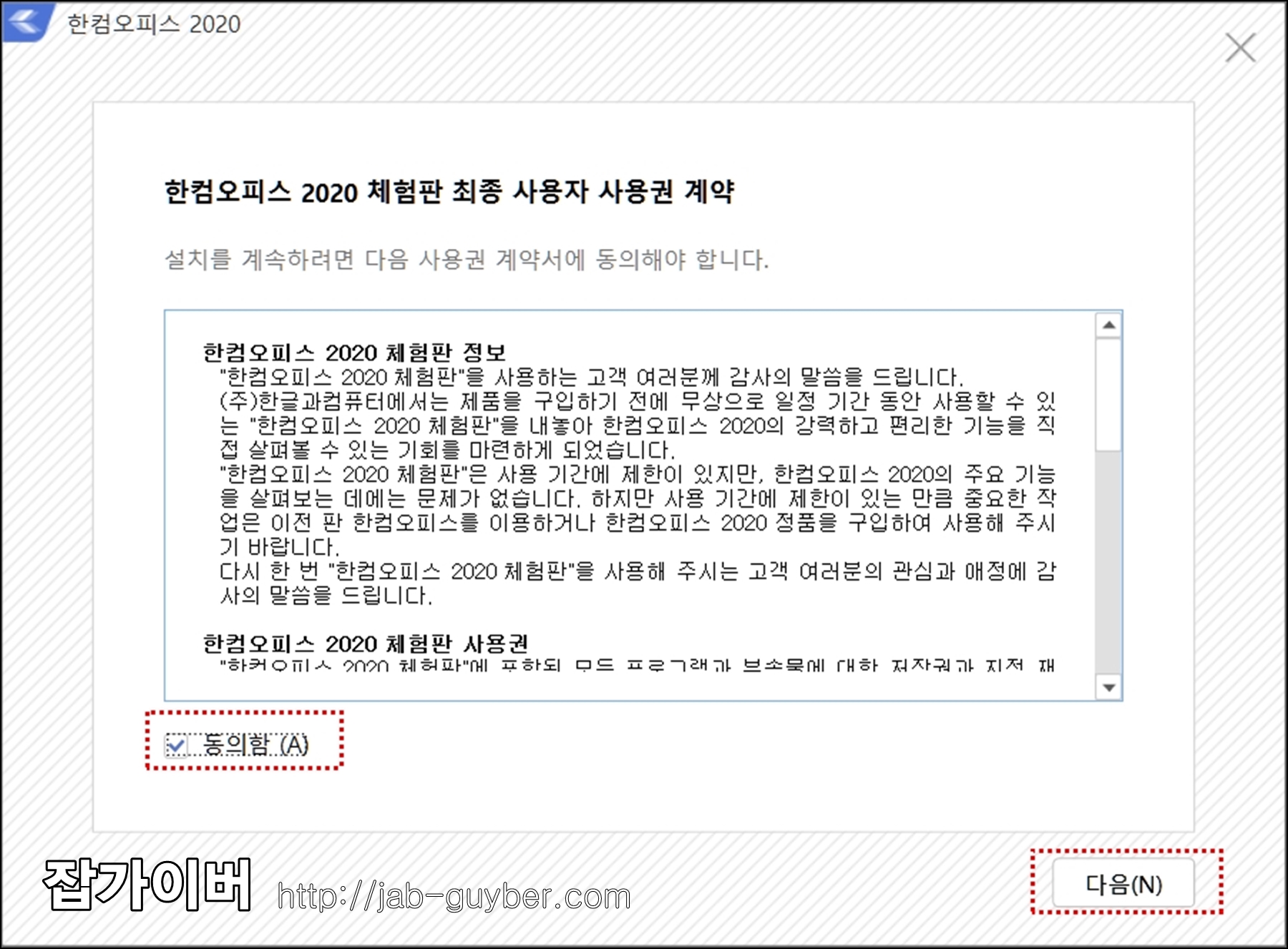 한컴오피스 2020 체험판 최종 사용자 사용권 계약에 동의를 하면 설치가 진행됩니다.