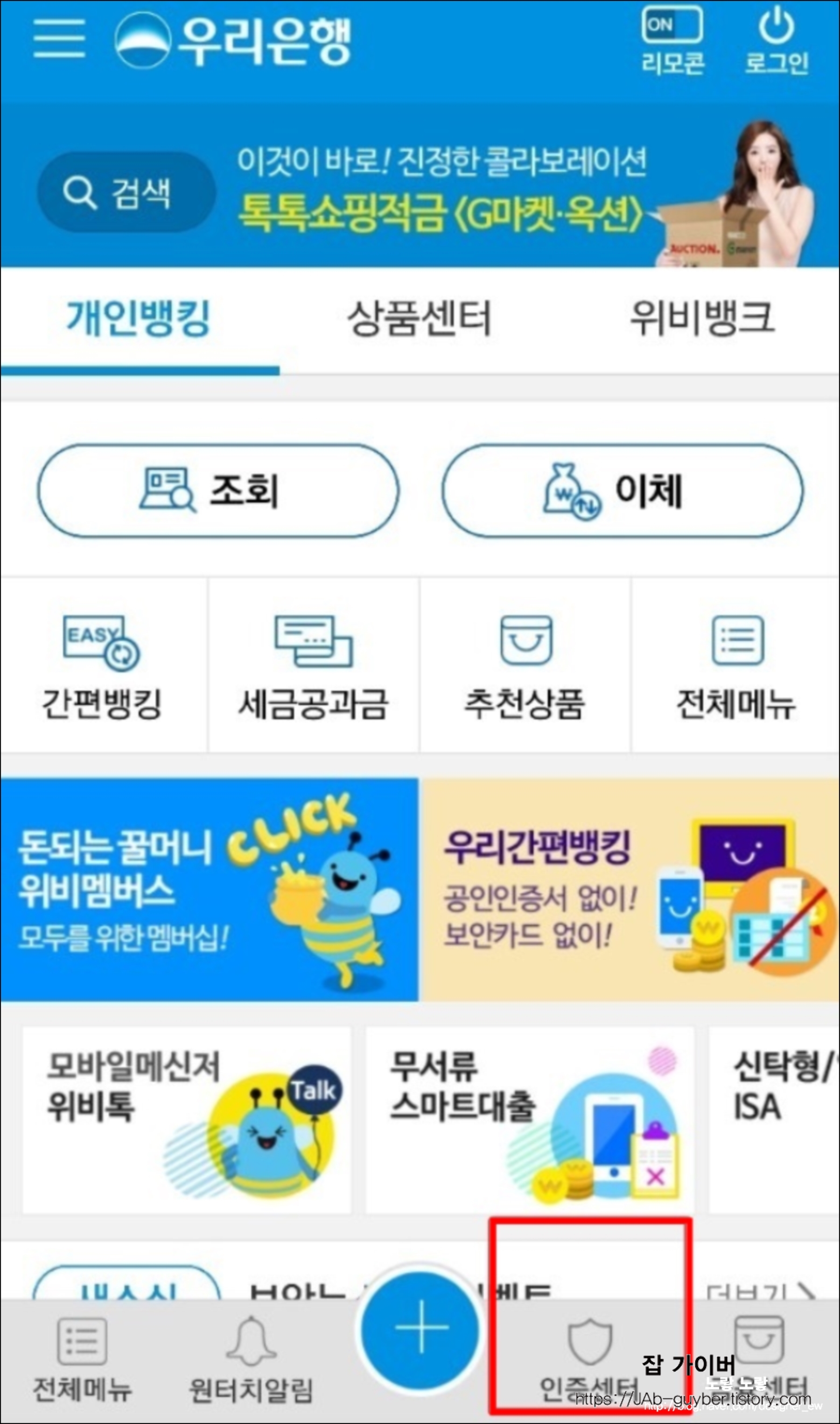 우리은행 앱 기준으로는 화면 하단이나 우측 메뉴에서 공인인증센터·공동인증센터 항목을 찾고, 그 안으로 들어가면 인증서 관련 기능들이 한 번에 모여 있습니다.