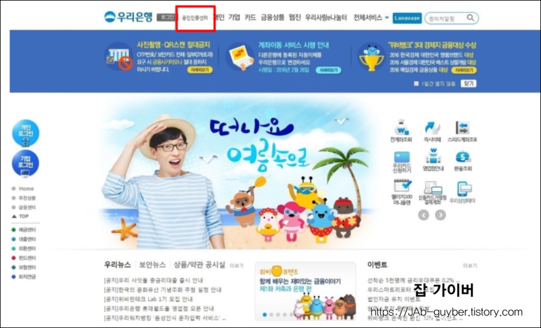 은행사이트에 접속했다면 상단에 있는 "공인인증서"항목을 선택합니다.