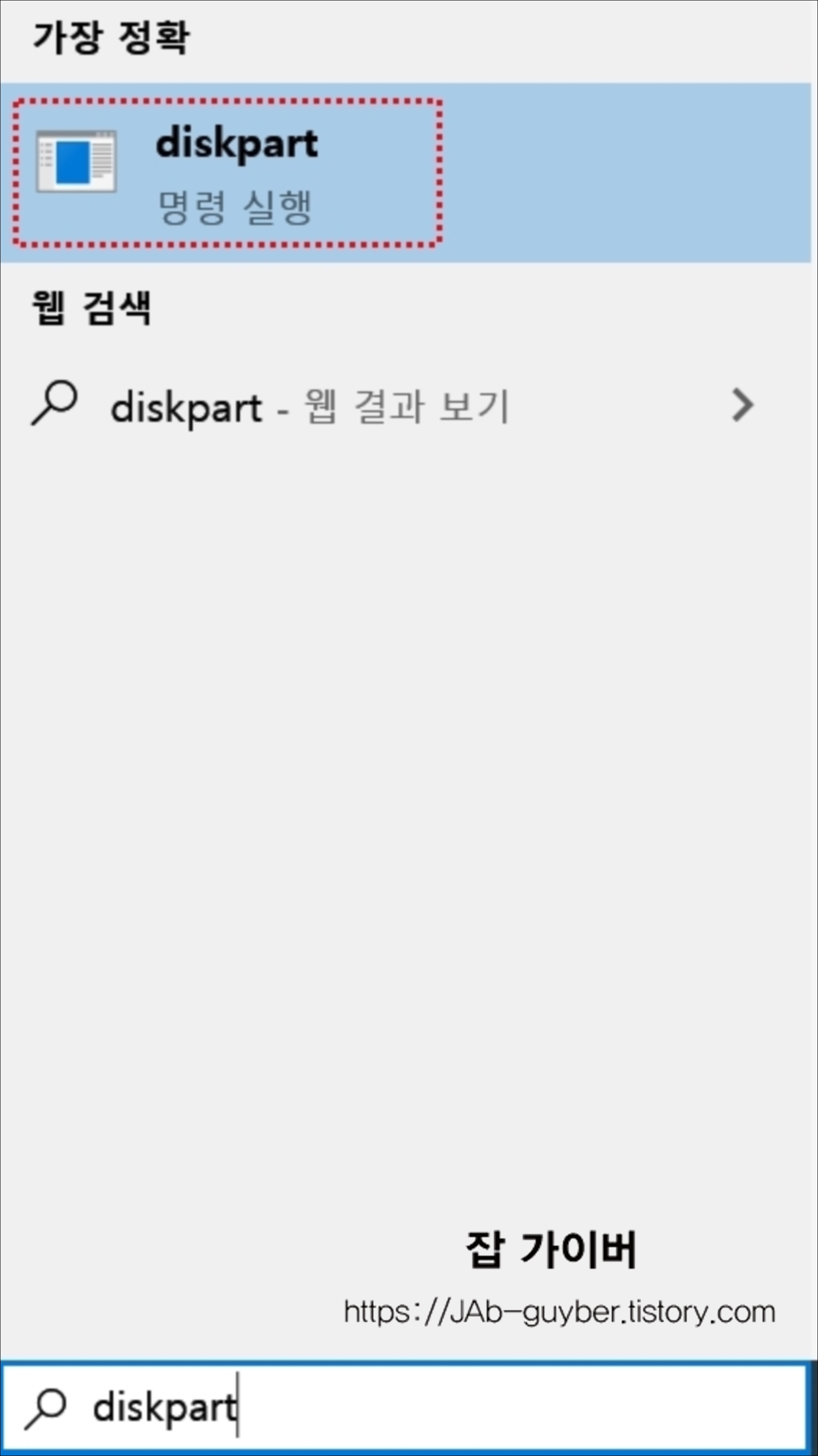 - '시작'을 클릭 후 "DiskPart"를 입력해 실행합니다.