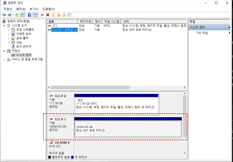 - 마지막으로, '제어판'에서 '디스크 관리'로 들어가 파티션 상태를 확인합니다. '할당되지 않음' 부분에서 우클릭하여 포맷 또는 파티션 활성화 작업을 진행합니다.