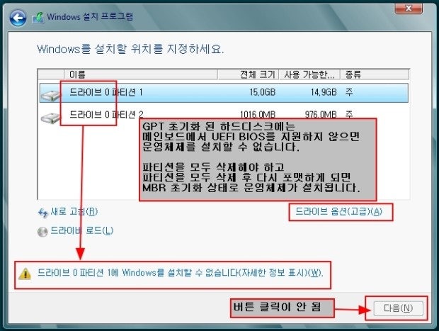 윈도우 설치 "선택한 디스크에 MBR 파티션 테이블이 있습니다"