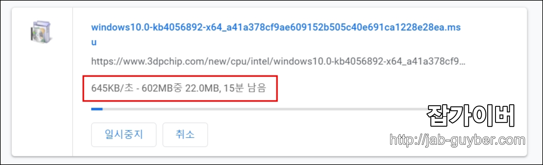 용량이 600mb정도로 용량이 좀 큰 편이며 다운로드가 완료되었다면 "Windows 업데이트 독립 실행형 설치관리자"가 실행되며 설치를 진행합니다.