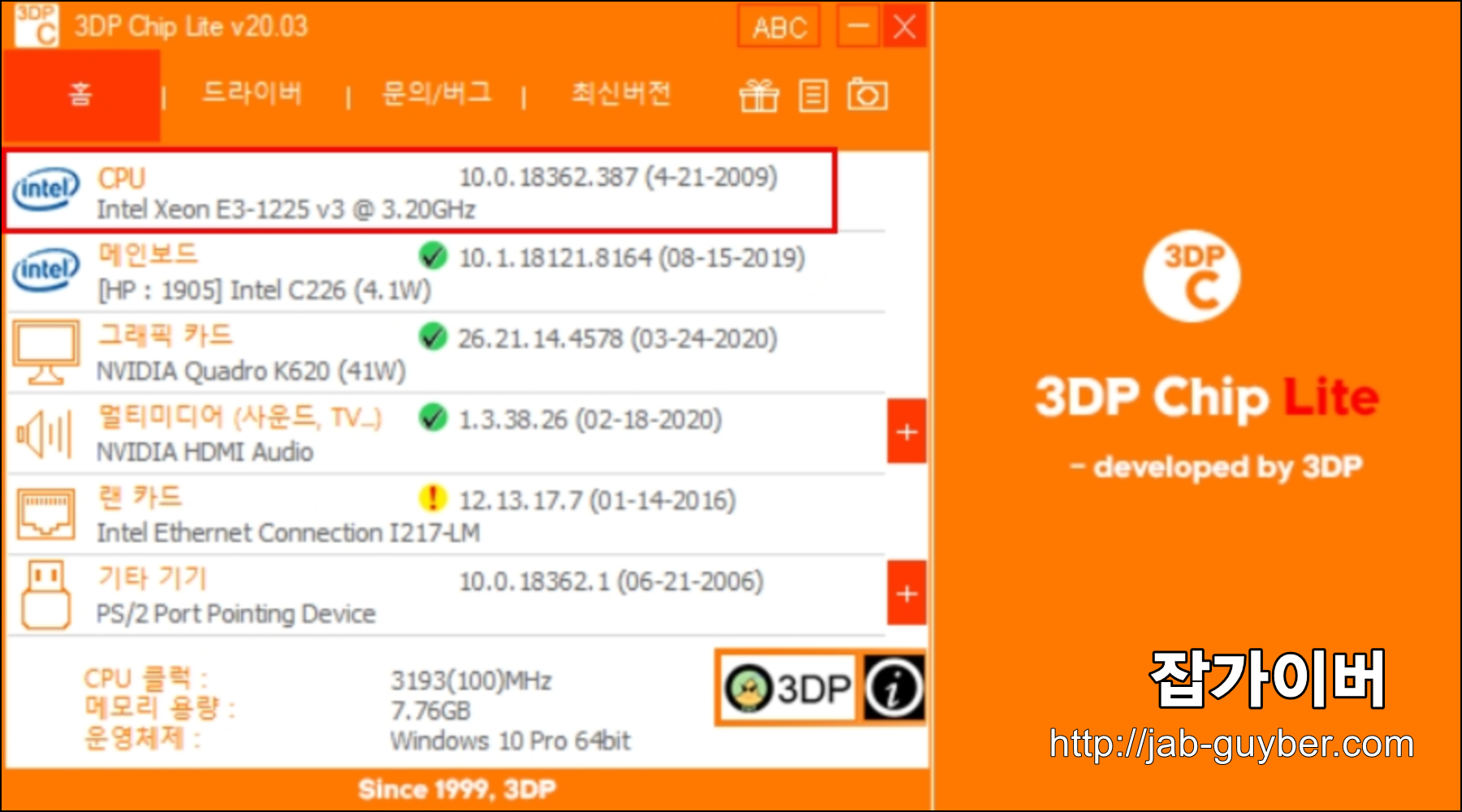 3DP Chip에서 간혹 일부 모델명을 간략하게 표기하는 경우가 있습니다. 이럴 땐 CPU-Z 같은 추가 시스템 정보 프로그램으로 다시 확인하거나, 시스템 → 정보 → 장치관리자에서 확인하는 것이 정확합니다.