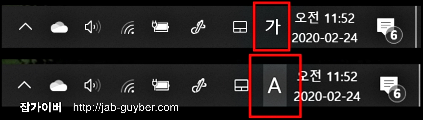 이후 다시 윈도우 화면의 우측하단을 보면 영문 A 부분이 가로 변경되어 한글이 쳐지느것을 볼 수 있습니다.