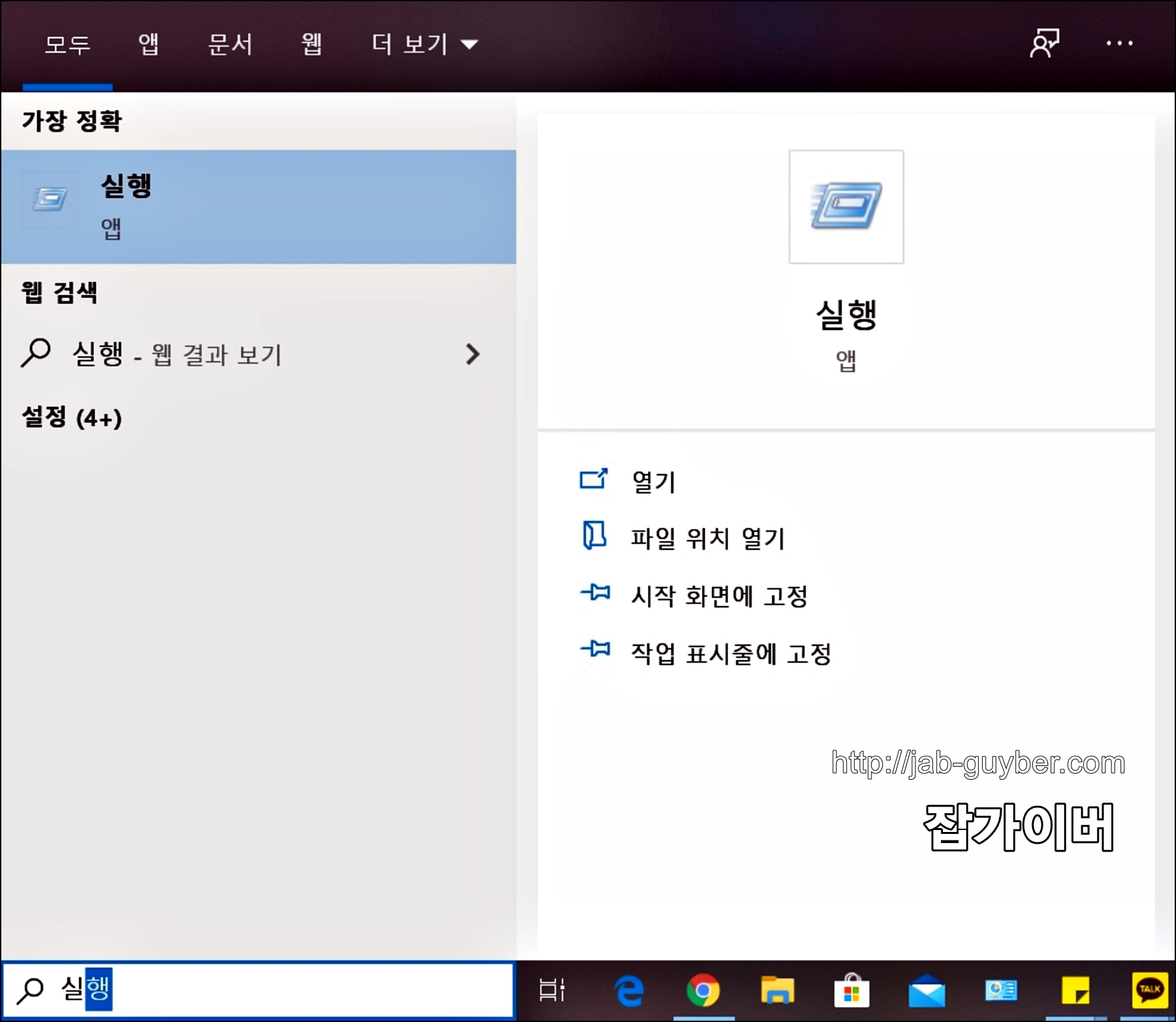 윈도우키를 눌러 검색창에 "실행"을 검색합니다.