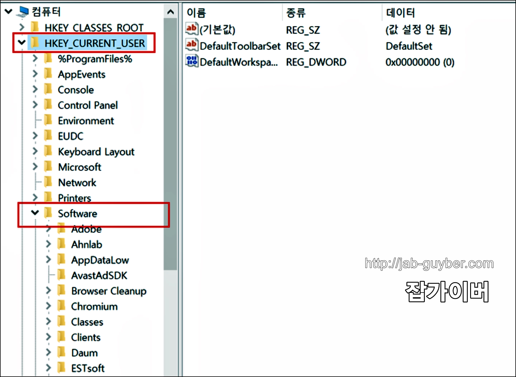 가장먼저 HKEY_CURRENT_USER 경로를 선택 후 Software 폴더를 선택합니다.