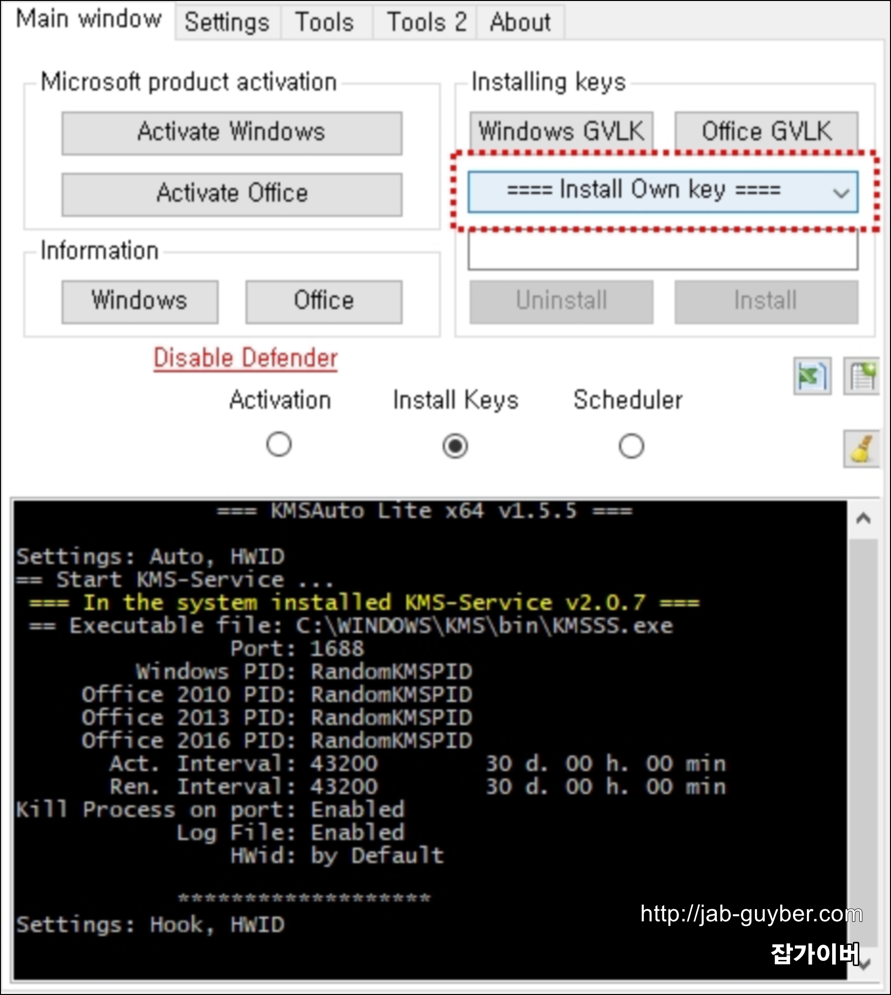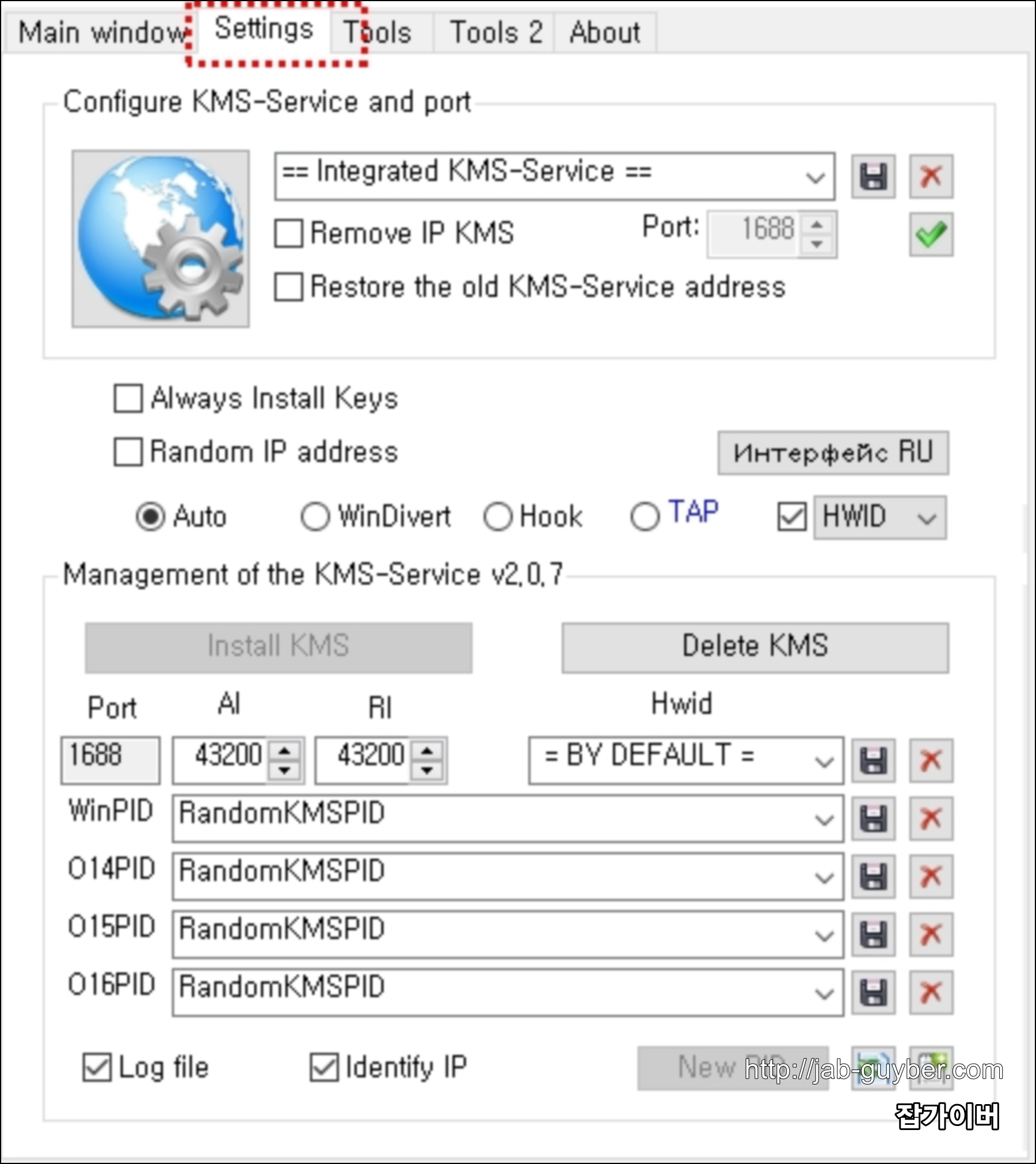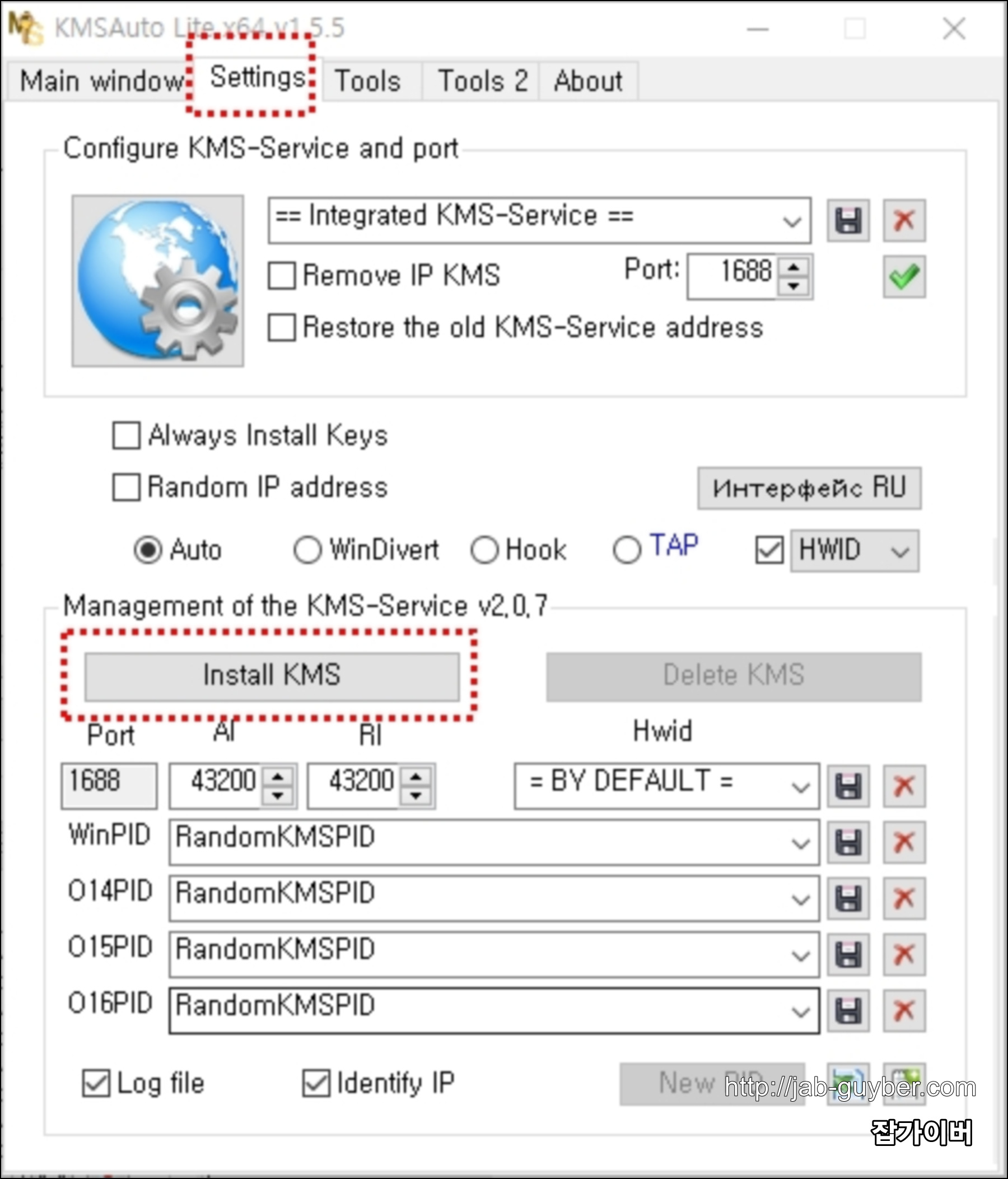 설정으로 들어가면 KMS 서버를 설치하거나 기존에 설치한 데이터를 삭제할 수 있습니다.