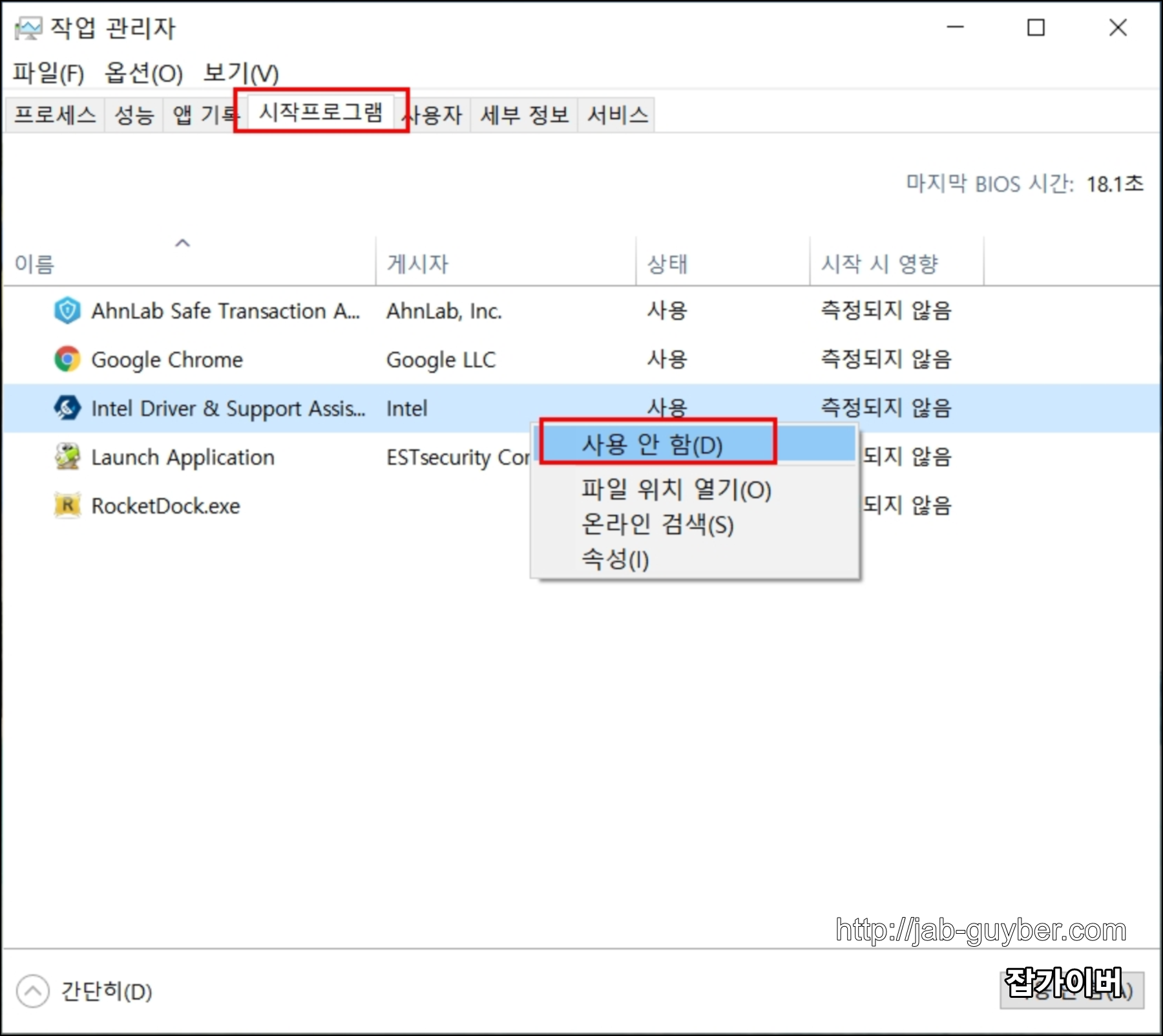 마지막으로 작업 관리자의 시작프로그램 탭에서도 부팅 시 필요 없는 프로그램을 선택해 "사용안함"으로 윈도우 시작시 프로그램을 관리할 수 있습니다.