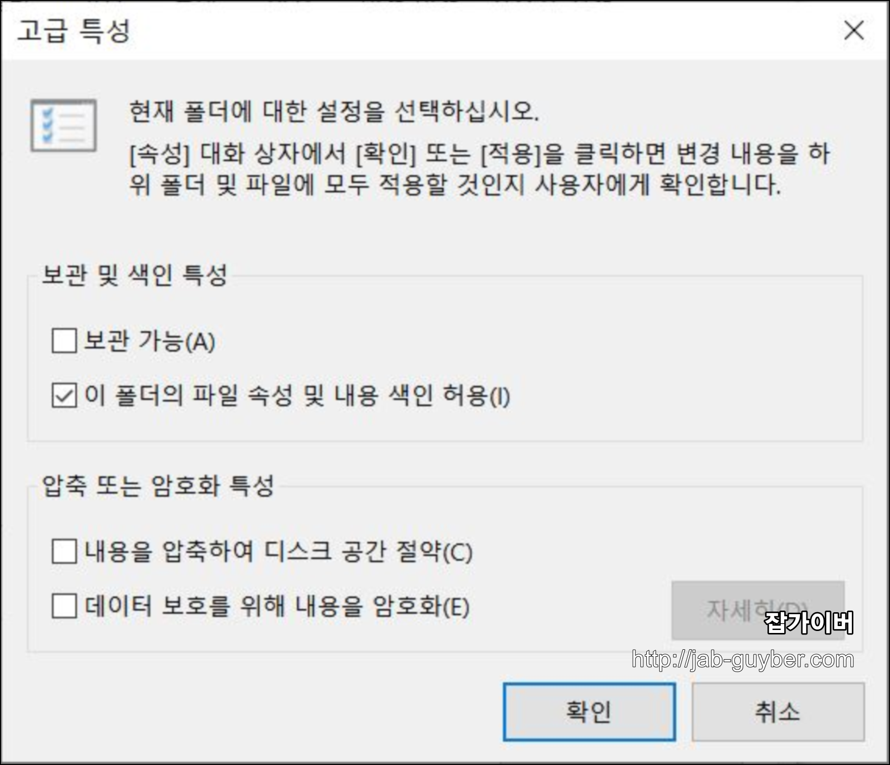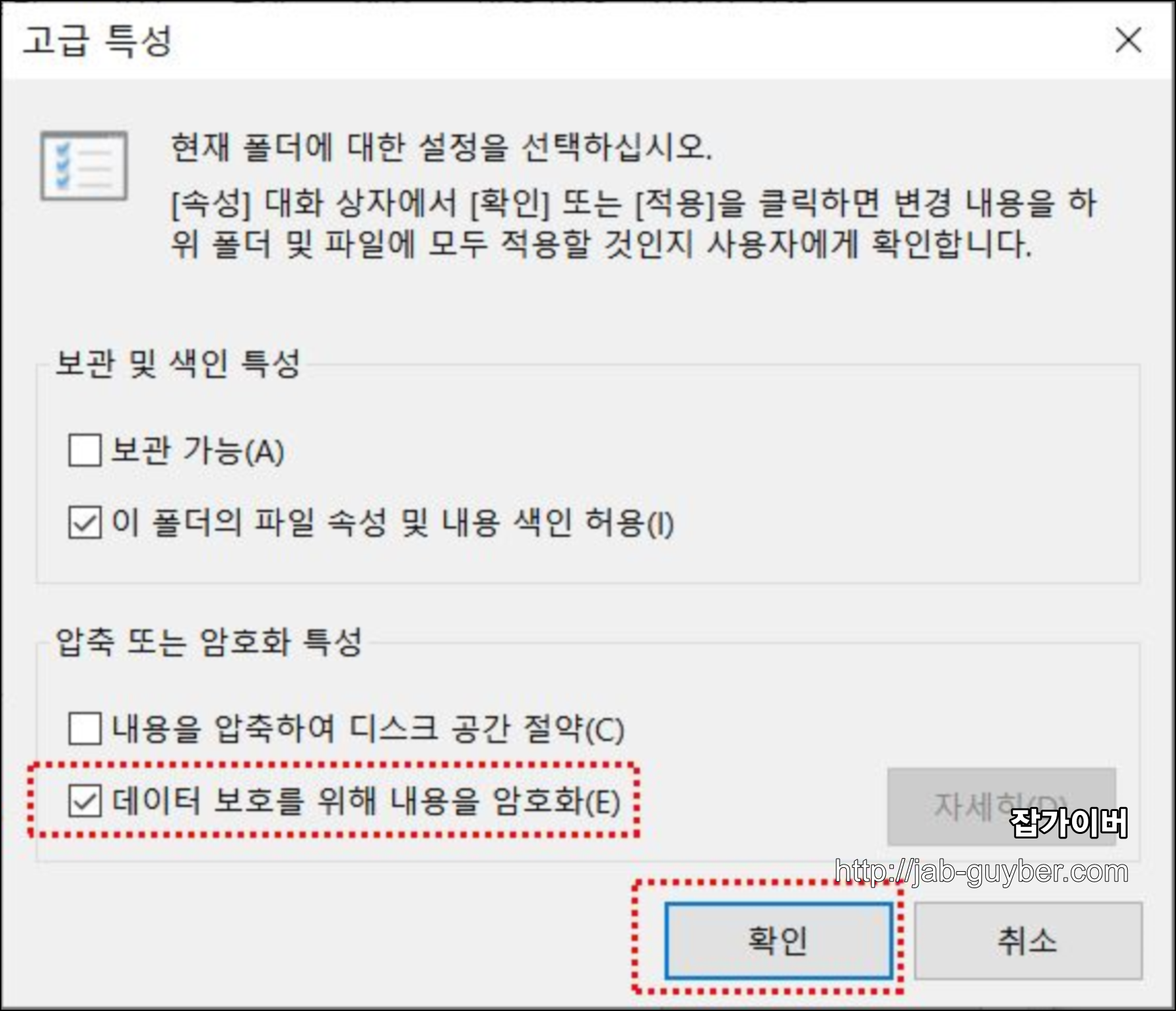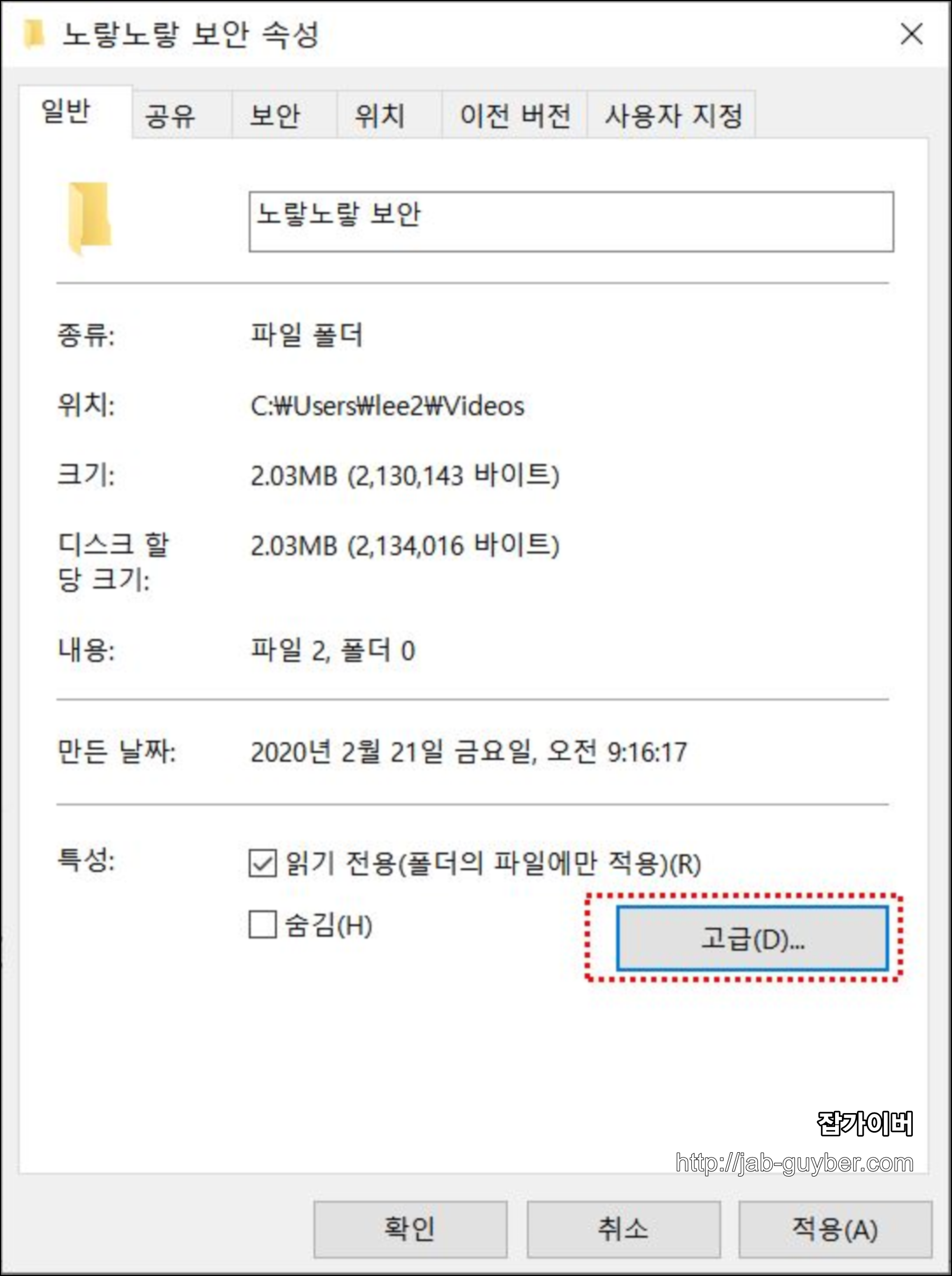 속성 화면에서 고급으로 들어가서, 데이터 보호를 위해 내용을 암호화를 체크합니다. (옆의 “내용 압축”은 보안이 아니라 용량 절감 목적이라 성격이 다릅니다.)