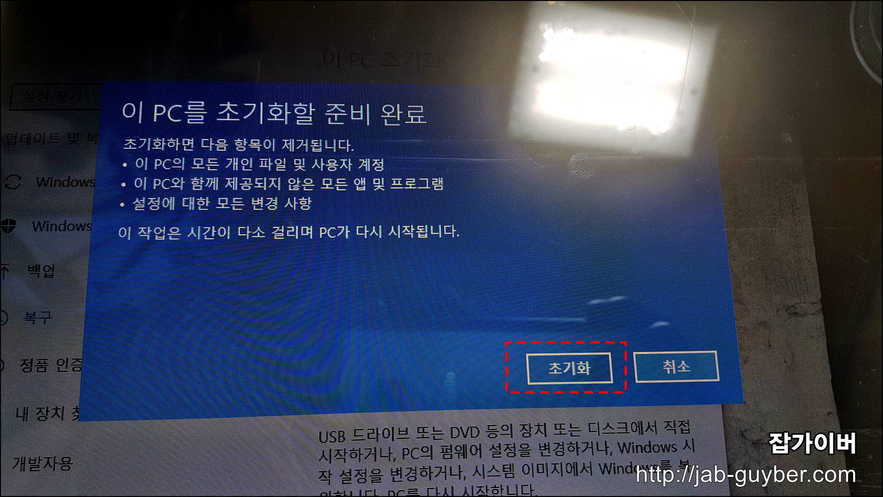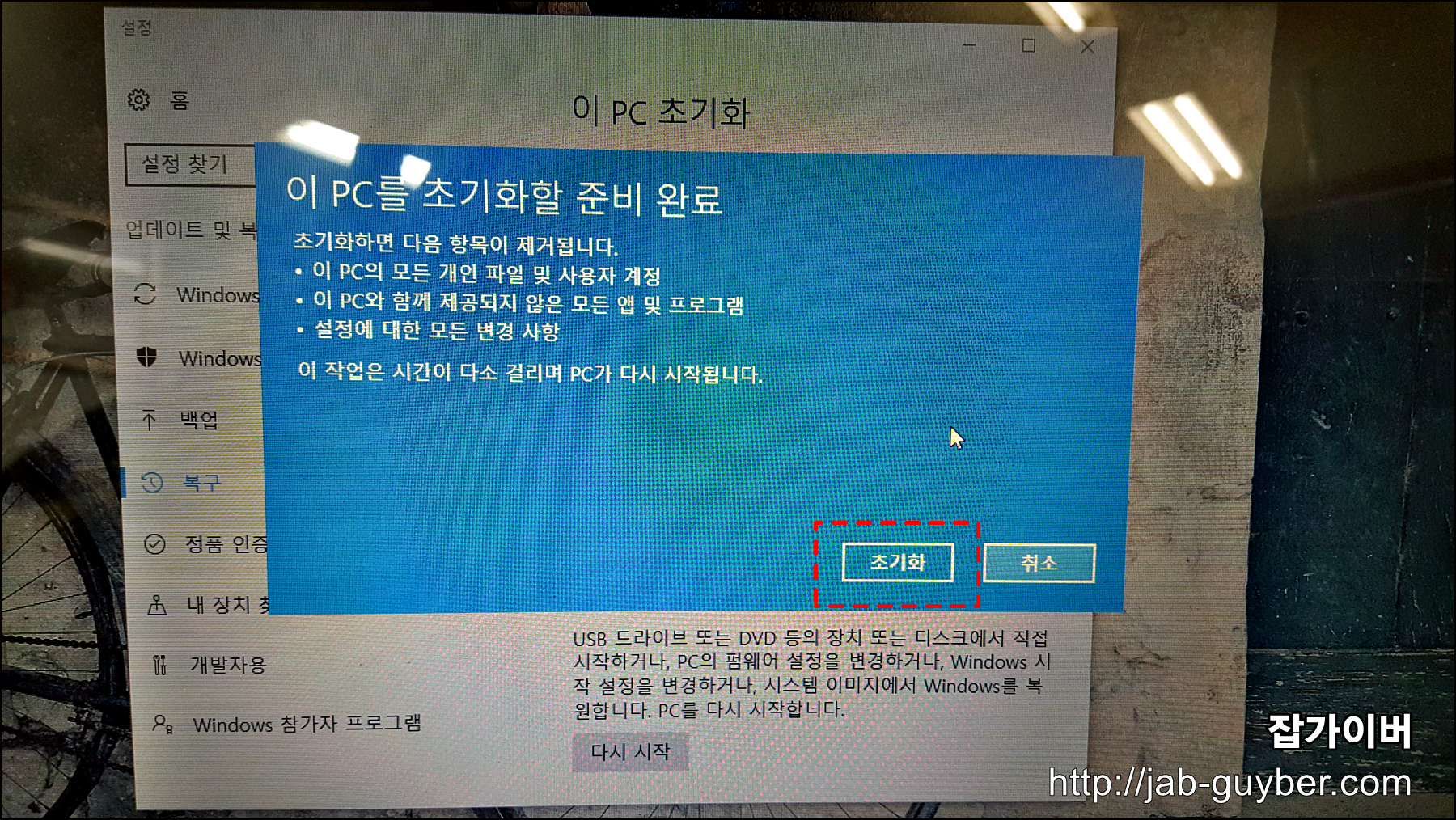 내용 확인 후 초기화를 누르면 재부팅하면서 복구가 진행됩니다.