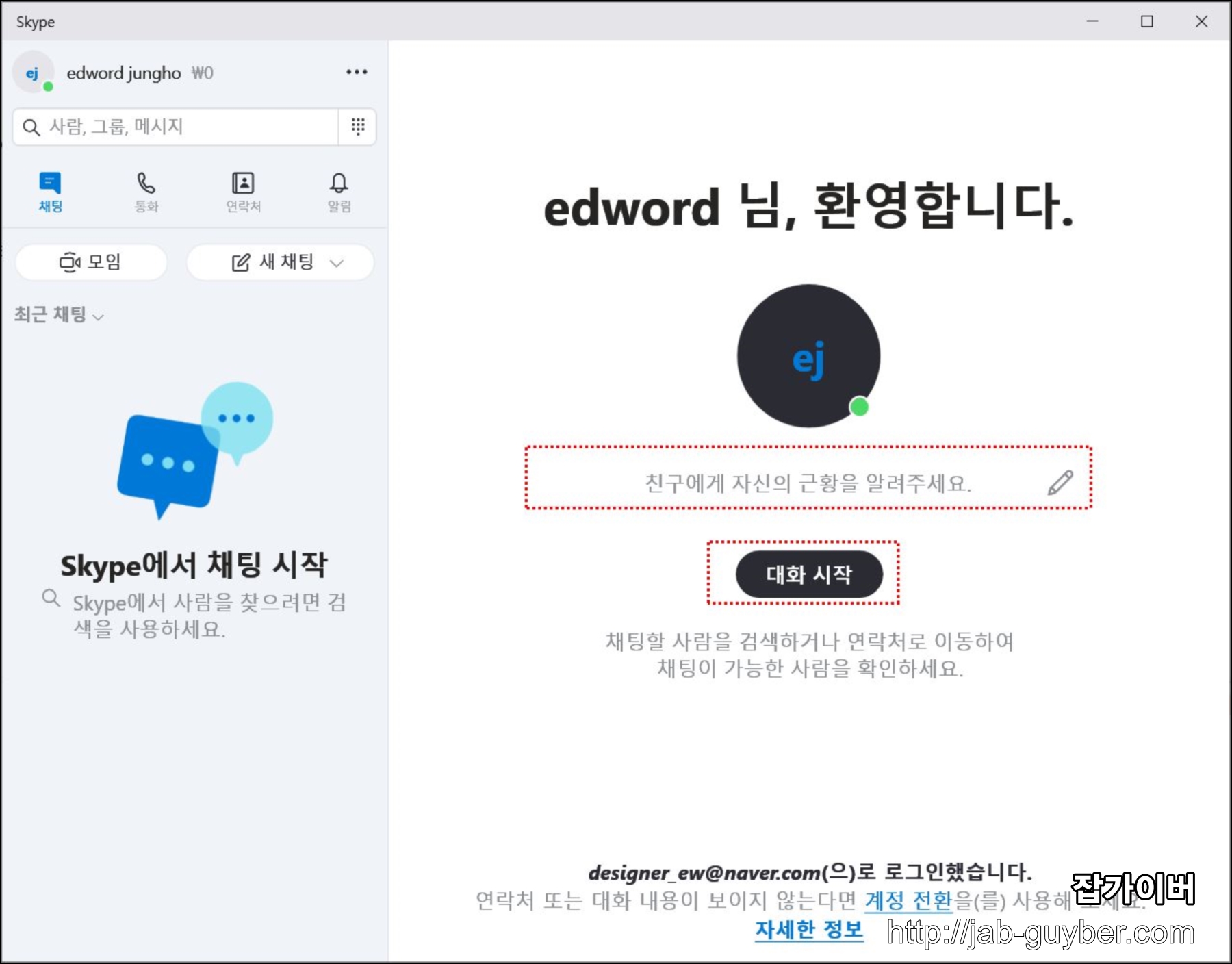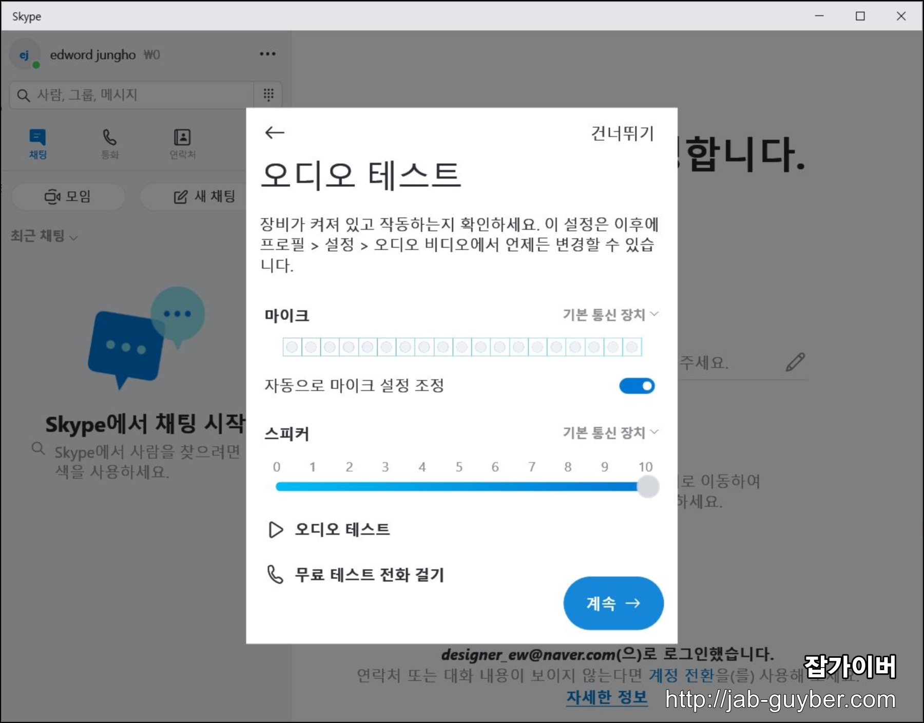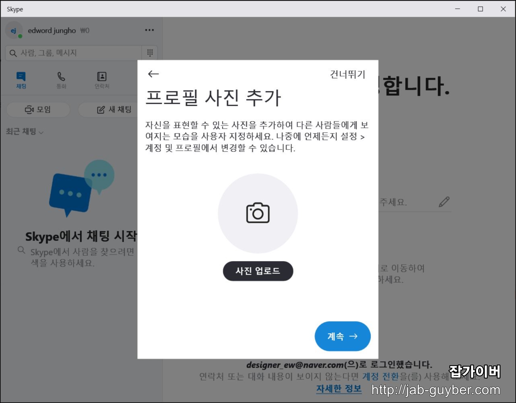 이후 스카이프 설치 및 기본적인 로그인 설정이 완료되었습니다.