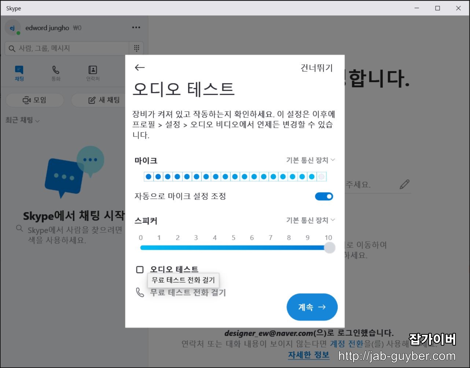 이후 화상채팅에 필요한 비디오 테스트 "카메라"장치가 있다면 확인하고 마무리합니다.