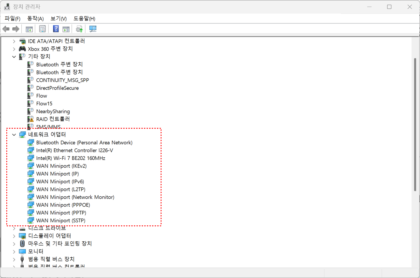 만약 항목에 없다면 무선랜카드가 제대로 인식되지 않는 것입니다.