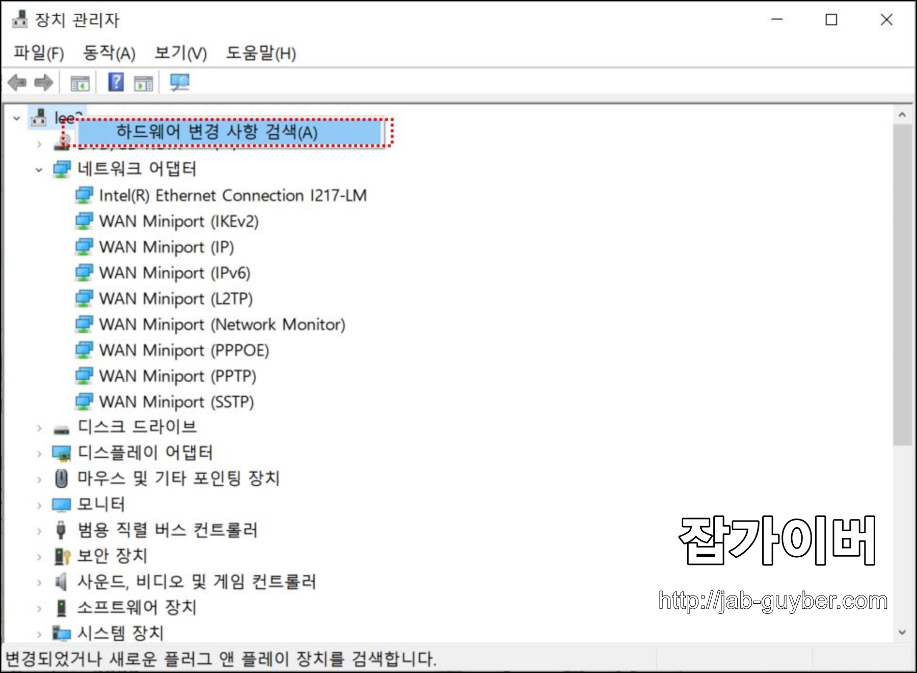 삭제가 완료되었다면 "하드웨어 변경 사항 검색"을 합니다.