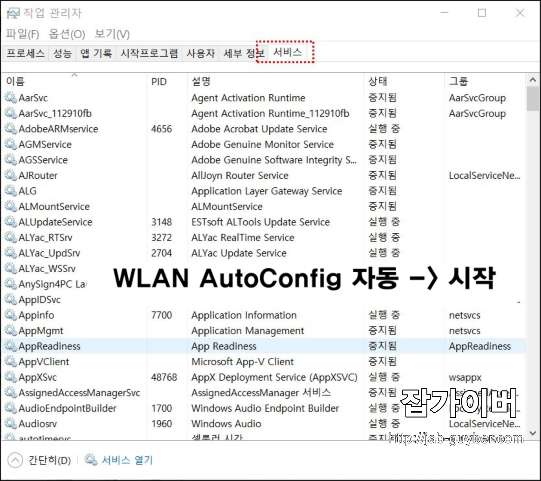 - 작업 관리자 -> 서비스 이동 후 목록 중 "WLAN AutoConfig"항목을 찾습니다.