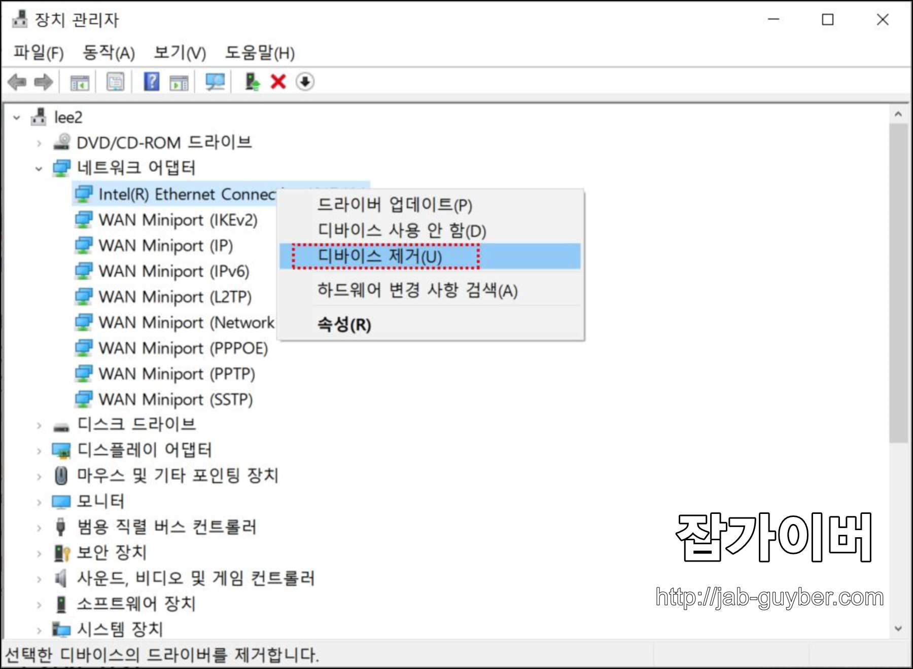 디바이스 제거를 통해 기존에 설치된 무선 랜카드를 삭제 후 재설치를 진행해봅니다.
