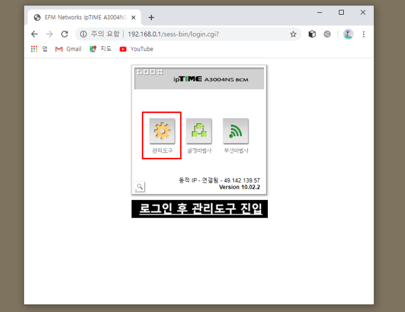 저 같은 경우 아이피타임 공유기가 아니라 넷기어 공유기를 사용하고 있기 때문에 기본 게이트웨이가 192.168.1.1로 표기되며 각 공유기 주소가 다를 수 있으므로 해당 주소를 입력해 접속합니다.