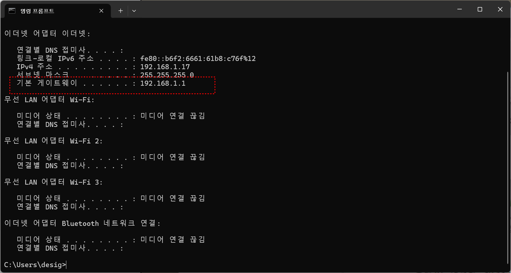 명령프롬프트(cmd)에서 아래 명령어 입력 후 기본 게이트웨이 주소 확인합니다.