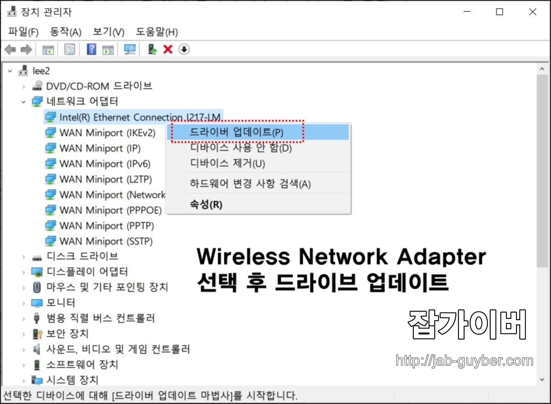 만약 정상적으로 Wireless Network Adapter가 있는데도 불구하고 인터넷이 안된다면 "디바이스 업데이트"를 진행해봅니다.