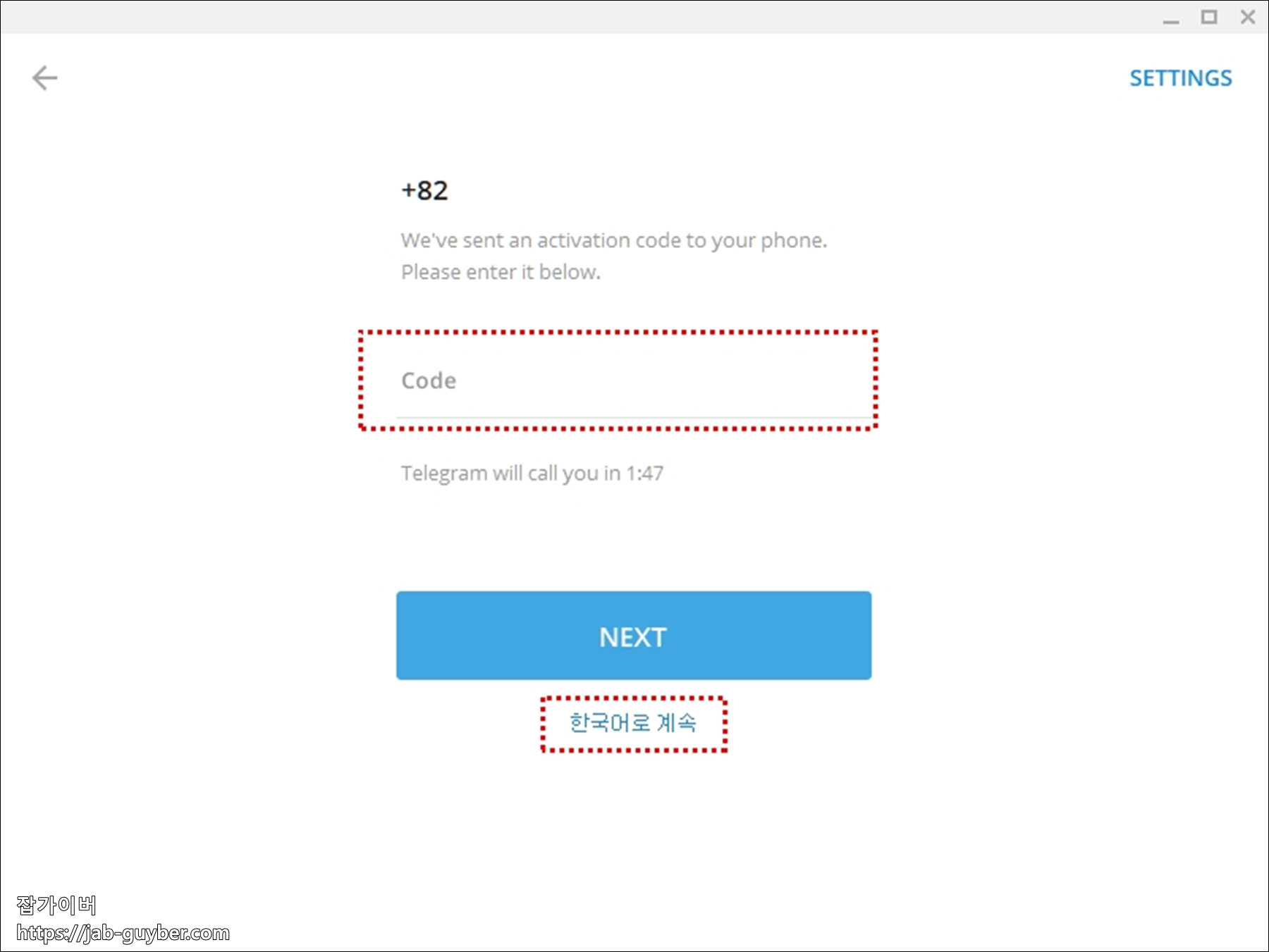 이때 "한국어로 계속"버튼을 클릭하면 "텔레그램 한글판"으로 사용할 수 있습니다.