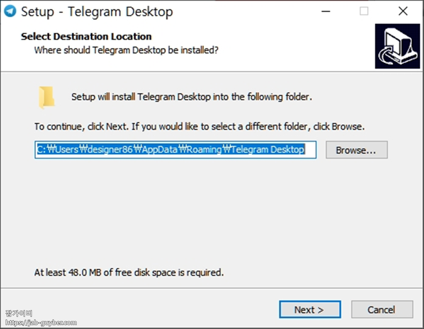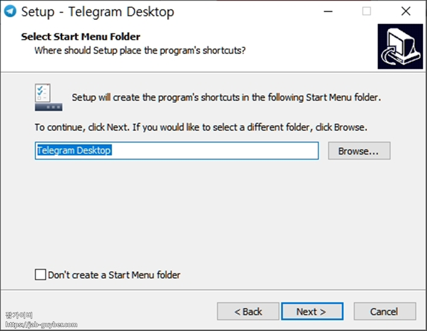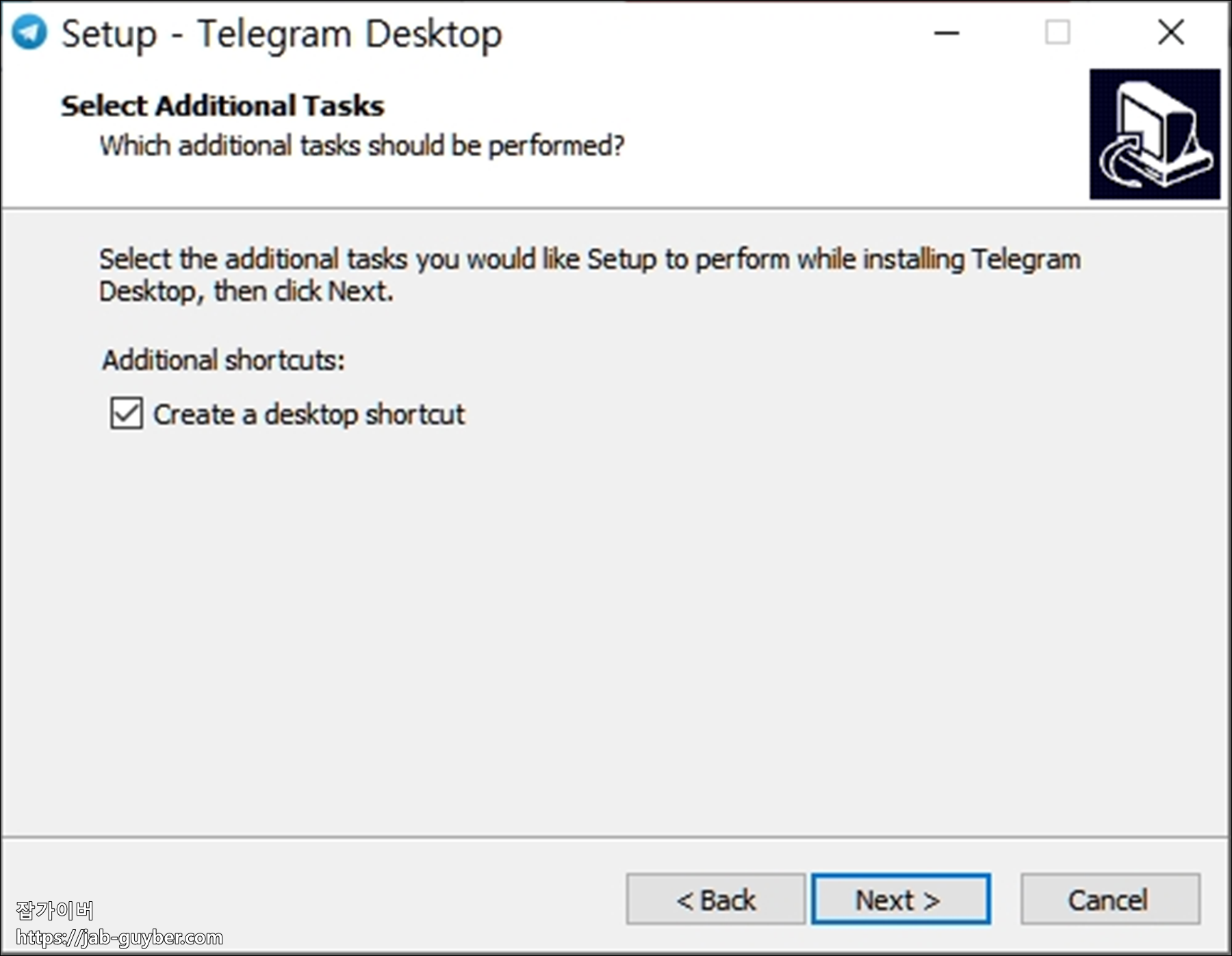 바탕화면에 Telegram 아이콘을 생성하고 싶다면 "Create a desktop shortcut"을 체크합니다.